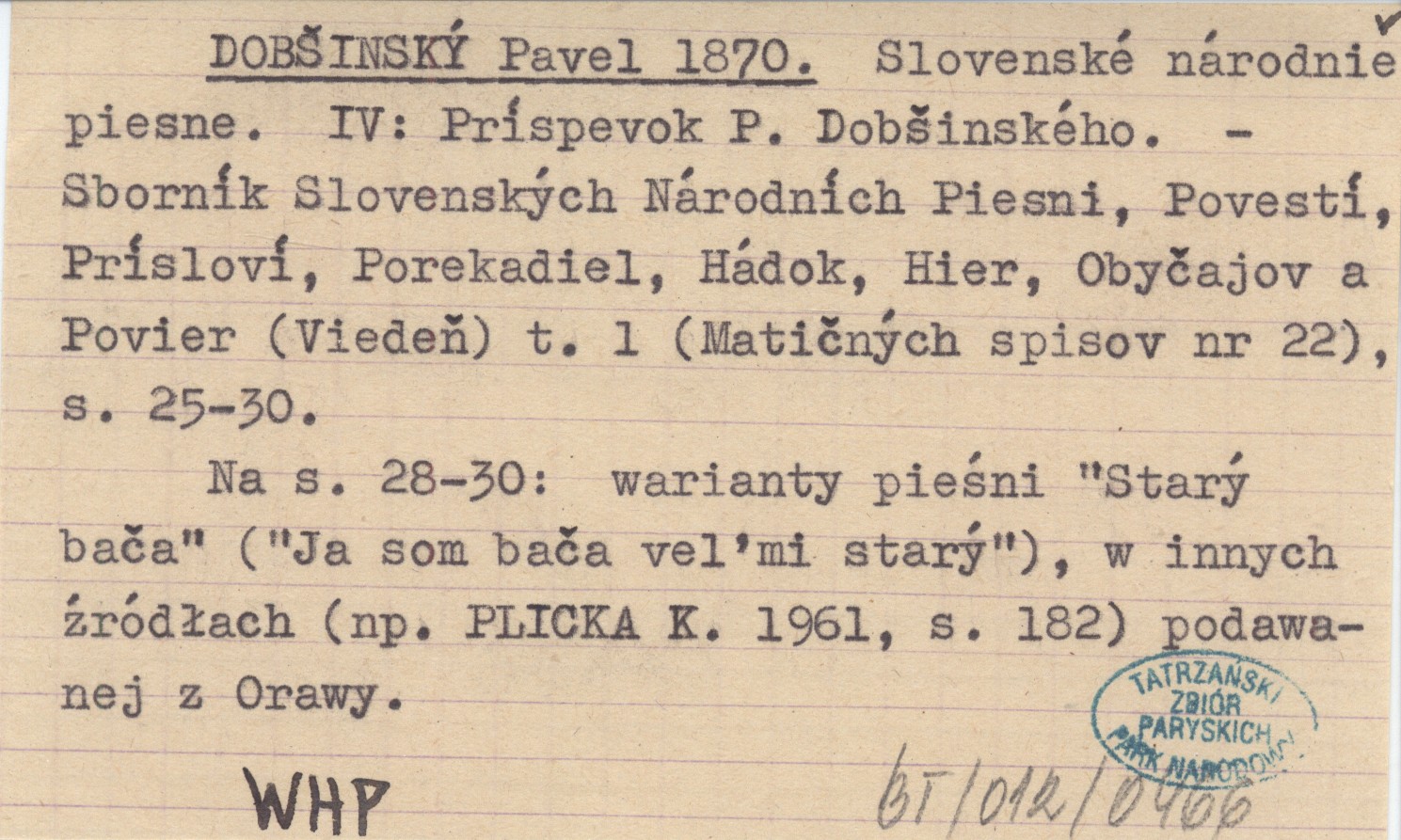 Sborník Slovenských Národních Piesni, Povestí, Prísloví, Porekadiel, Hádok, Hier, Obyčajov a Povier Viedeň (Matičných spisov ; nr 22) , T. 1: 25-30. Na s. 28-30: warianty pie¶ni "Starý bača" ("Ja som bača veµmi starý"), w innych Ľródłach (np. PLICKA K. 1961, s. 182) podawanej z Orawy.