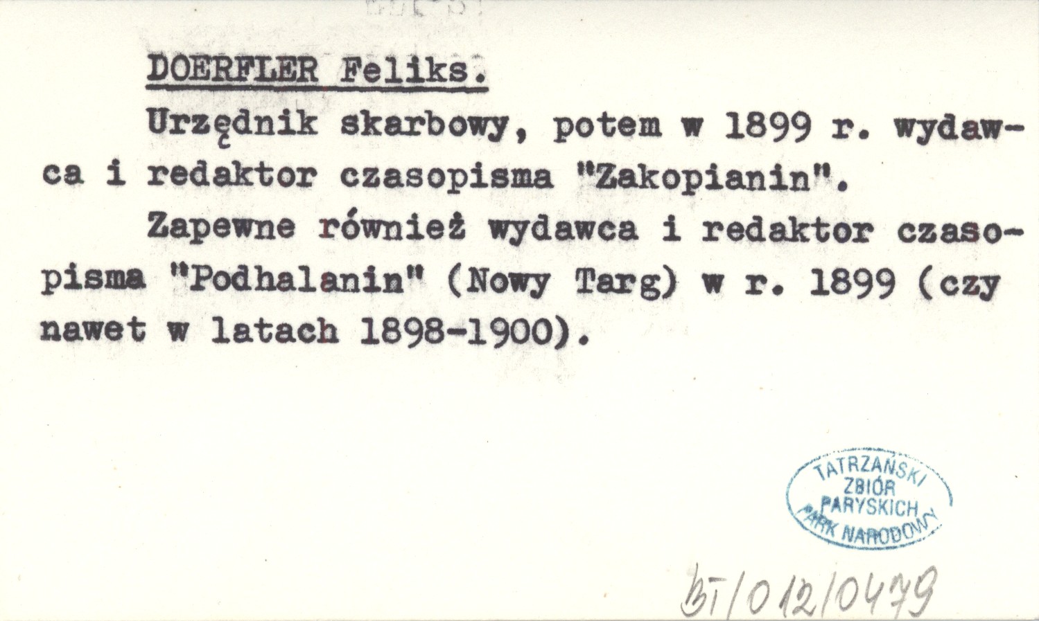Urzędnik skarbowy, potem w 1899 r. wydawca i redaktor czasopisma "Zakopianin". Zapewne róznież wydawca i redaktor czasopisma "Podhalanin" (Nowy Targ) w r. 1899 (czy nawet w latach 1898-1900).