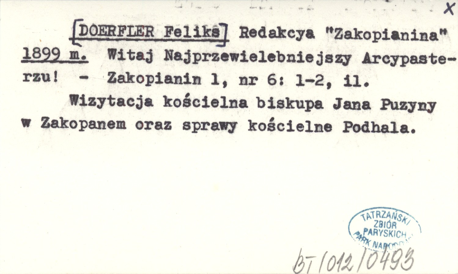 Redakcya "Zakopianina" [DOERFLER Feliks] 1899 m Witaj Najprzelewielebniejszy Arcypasterzu!