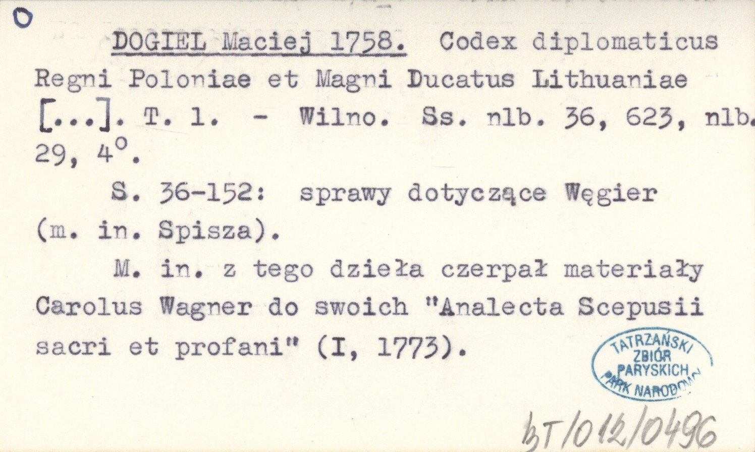 Wilno , T. 1: [36], 623, [29], 4°. S. 36-152: sprawy dotyczące Węgier (m. in. Spisza). M. in. z tego dzieła czerpał materiały Carolus Wagner do swoich "Analecta Scepusii sacri et profani" (I, 1773).