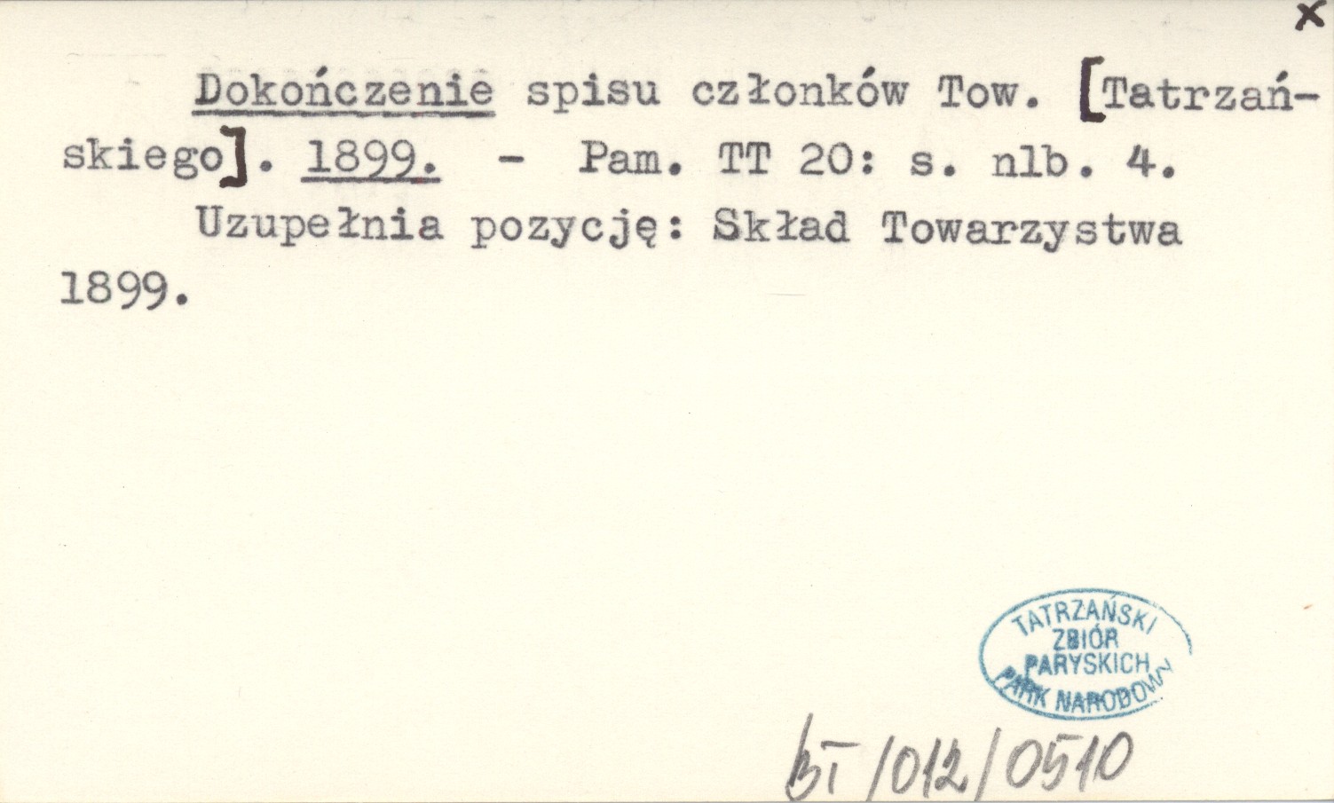 Pamiętnik Towarzystwa Tatrzańskiego, 20: [4]. Uzupełnia pozycję: Skład Towarzystwa 1899.