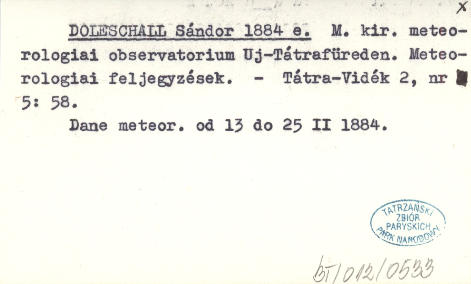 DOLESCHALL Sándor 1884 e M. kir. meteorologiai observatorium Uj-Tátrafüreden. Meteorologiai feljegyzések.