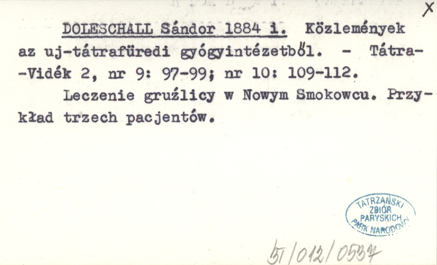 DOLESCHALL Sándor 1884 i Közlemények az uj-tátrafüredi gyógyintézetből.
