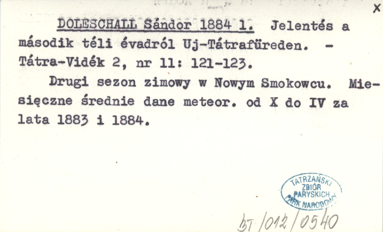 DOLESCHALL Sándor 1884 l Jelentés a második téli évadról Uj-Tátrafüreden.