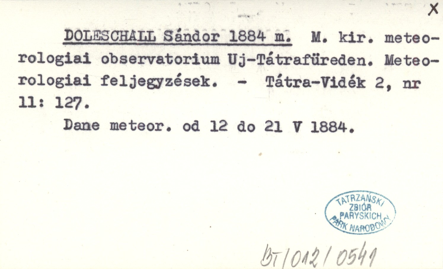 DOLESCHALL Sándor 1884 m M. kir. meteorologiai observatorium Uj-Tátrafüreden. Meteorologiai feljegyzések.