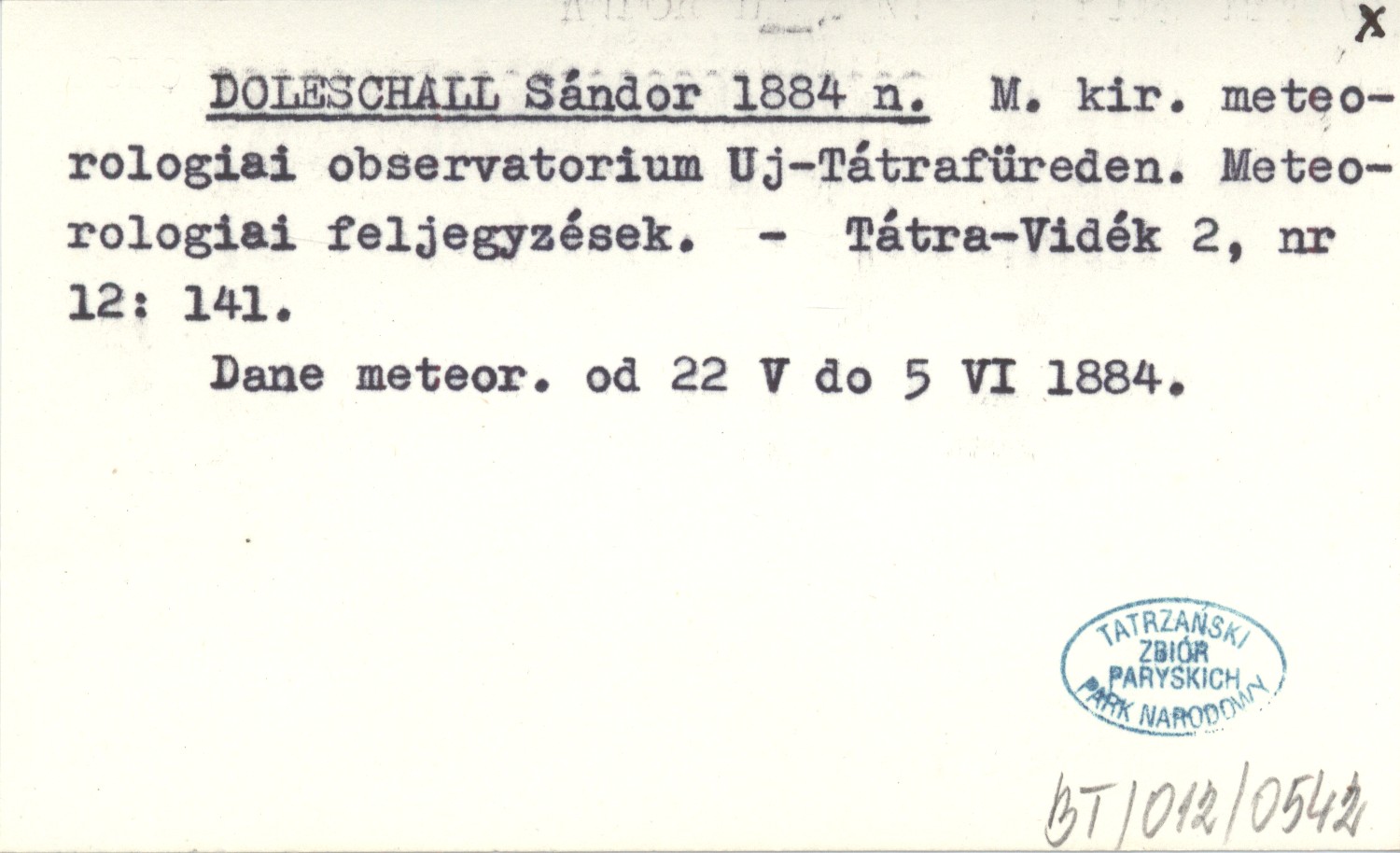 DOLESCHALL Sándor 1884 n M. kir. meteorologiai observatorium Uj-Tátrafüreden. Meteorologiai feljegyzések.