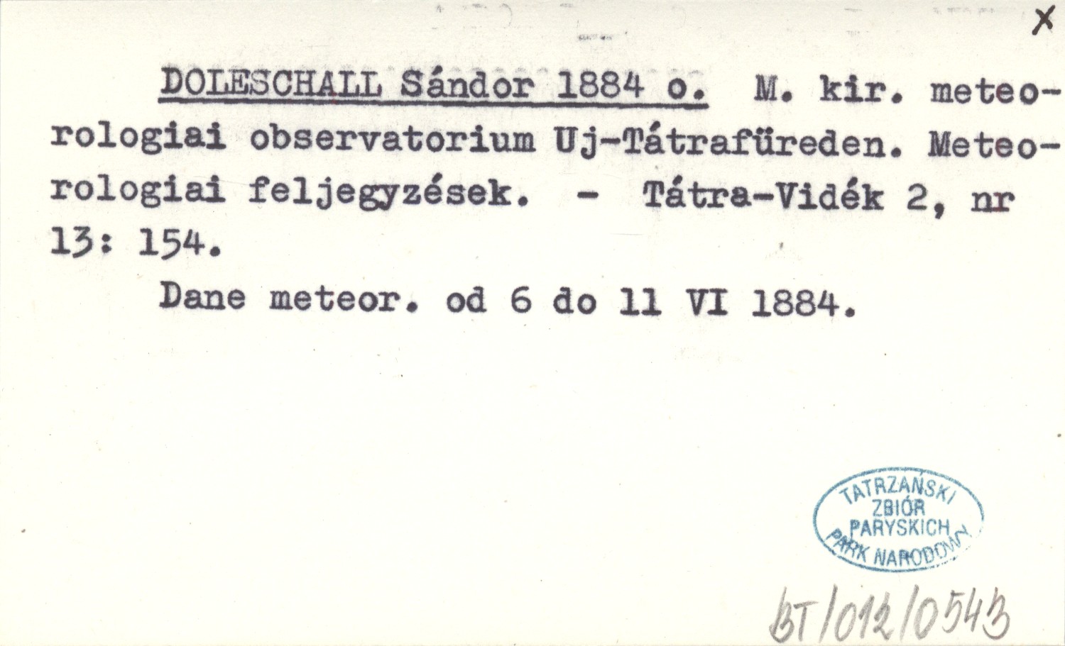 DOLESCHALL Sándor 1884 o M. kir. meteorologiai observatorium Uj-Tátrafüreden. Meteorologiai feljegyzések.