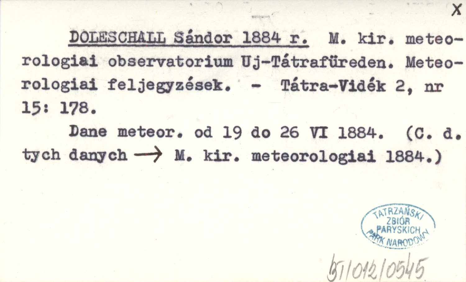 DOLESCHALL Sándor 1884 r M. kir. meteorologiai observatorium Uj-Tátrafüreden. Meteorologiai feljegyzések.
