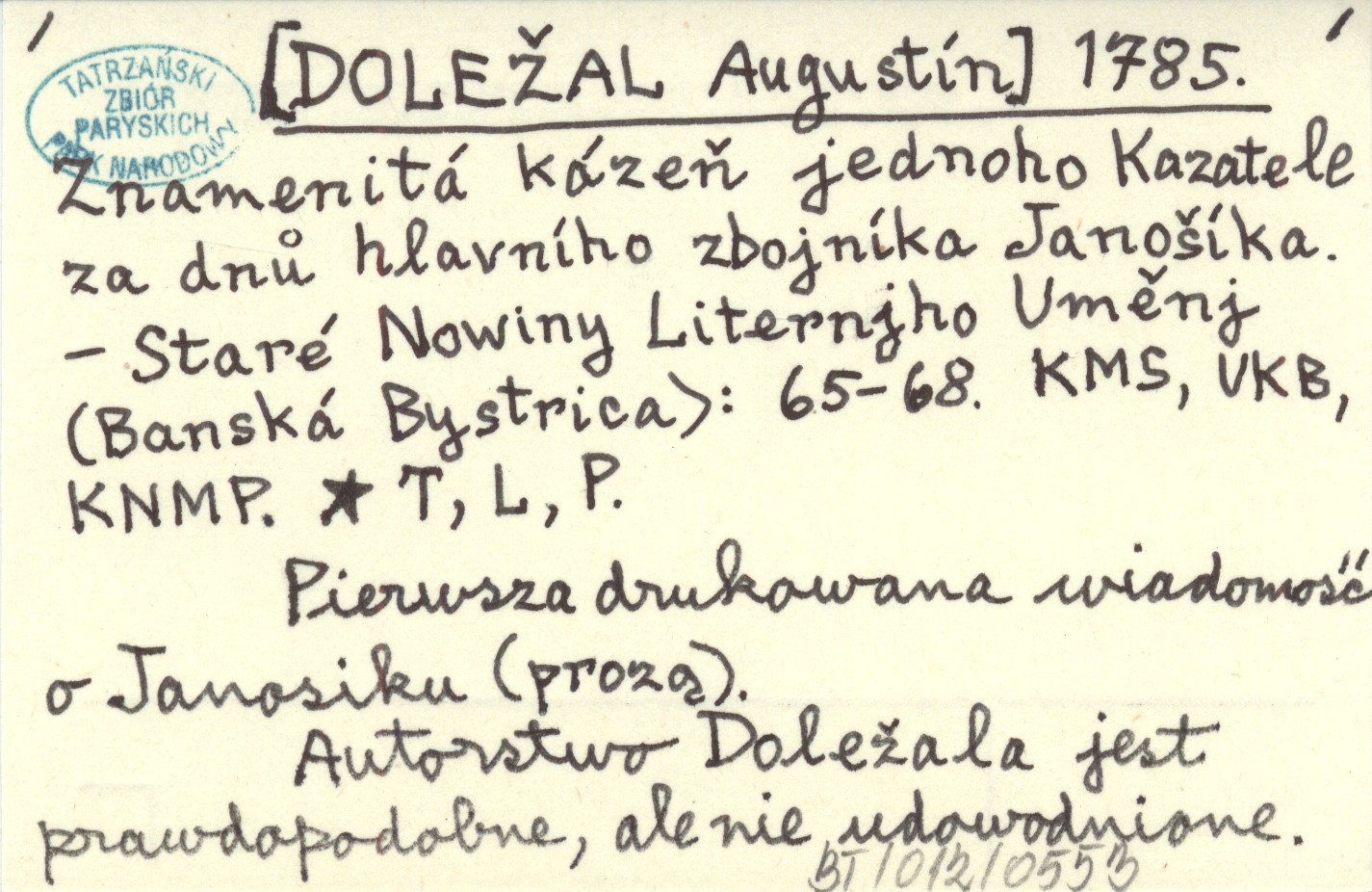 Staré Nowiny Liternjho Uměnj (Banská Bystrica) , S. 65-68. Pierwsza drukowana wiadomość o Janosiku (prozą). Autorstwo Doležala jest prawdopodobne, ale nie udowodnione.