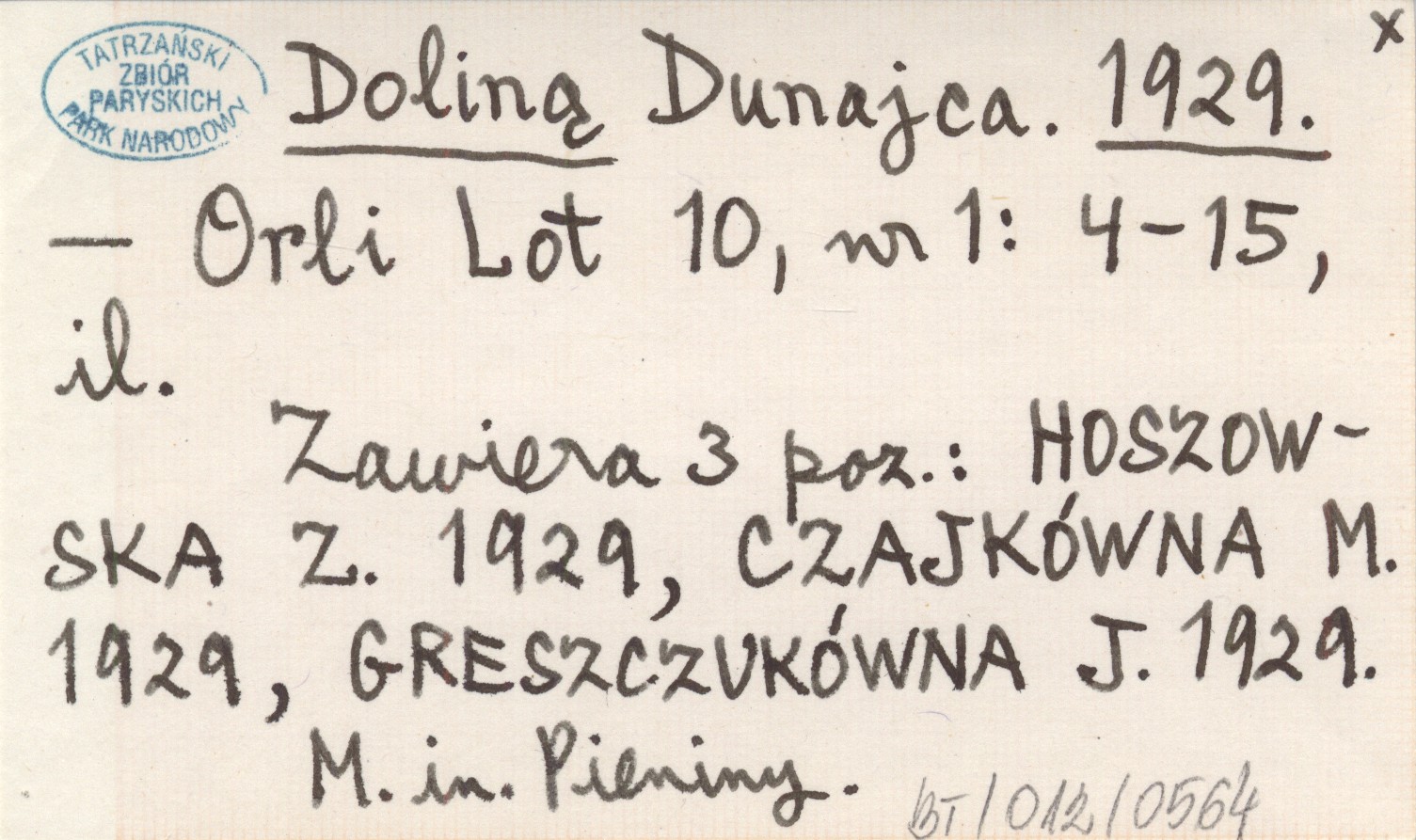 Orli Lot, 10, nr 1: 4-15, il. Zawiera 3 poz.: HOSZOWSKA Z. 1929, CZAJKÓWNA M. 1929, GRESZCZUKÓWNA J. 1929. M. in. Pieniny.