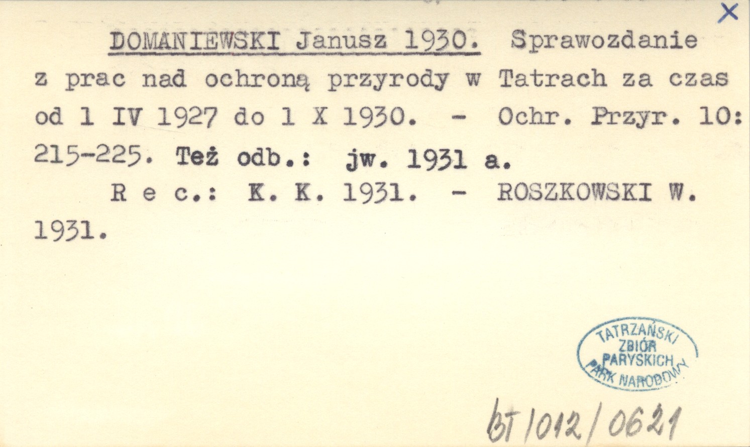DOMANIEWSKI Janusz 1930 Sprawozdanie z prac nad ochroną przyrody w Tatrach za czas od 1 IV 1927 do 1 X 1930.
