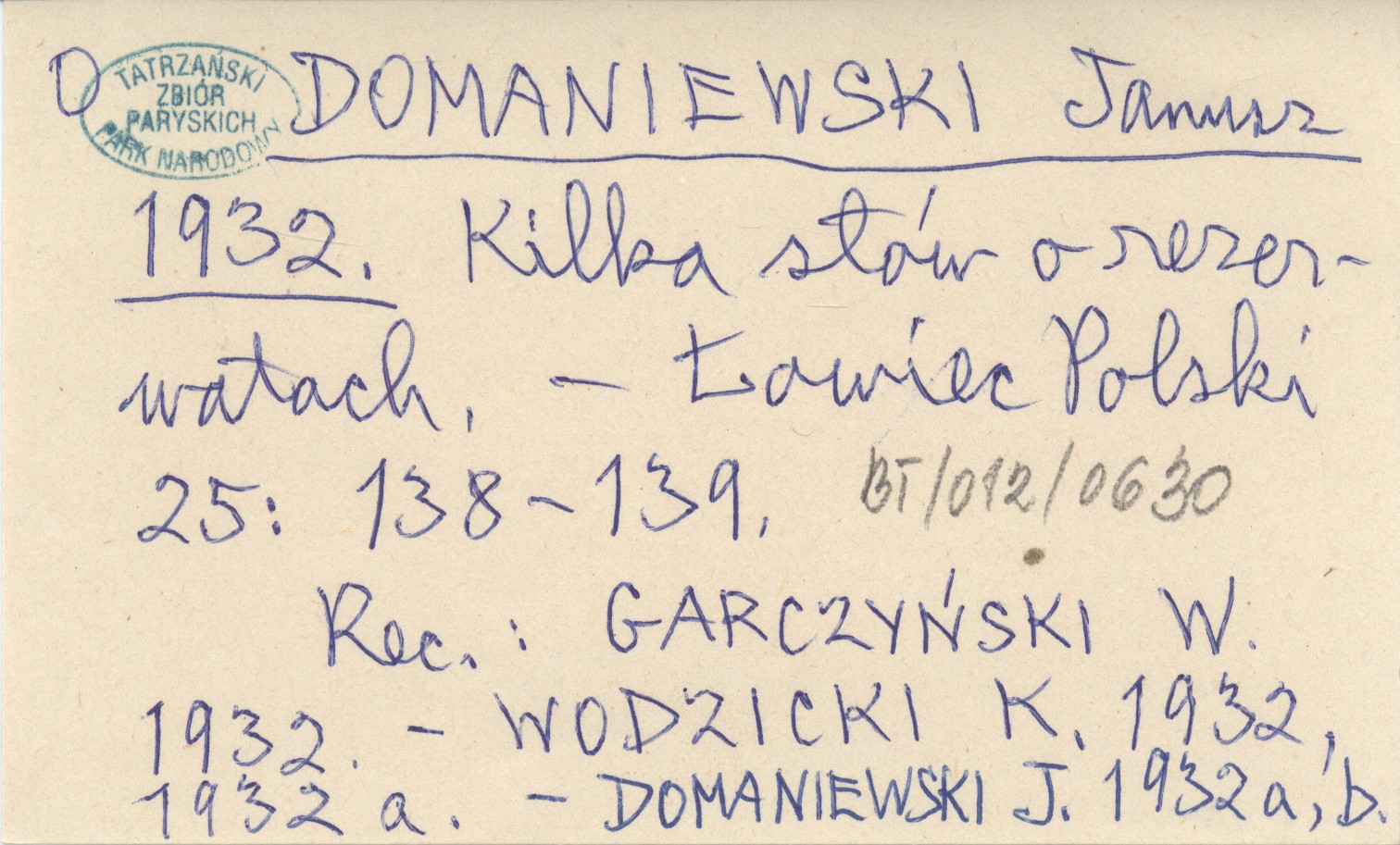 Łowiec Polski, 25: 138-139. REC: GARCZYŃSKI W. 1932 ; WODZICKI K. 1932, 1932 a ; DOMANIEWSKI J. 1932 a, b ;