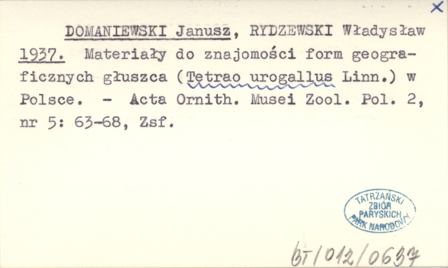 DOMANIEWSKI Janusz RYDZEWSKI, Władysław. ; 1937 Materiały do znajomości form geograficznych głuszca (Tetrao urogallus Linn.) w Polsce.