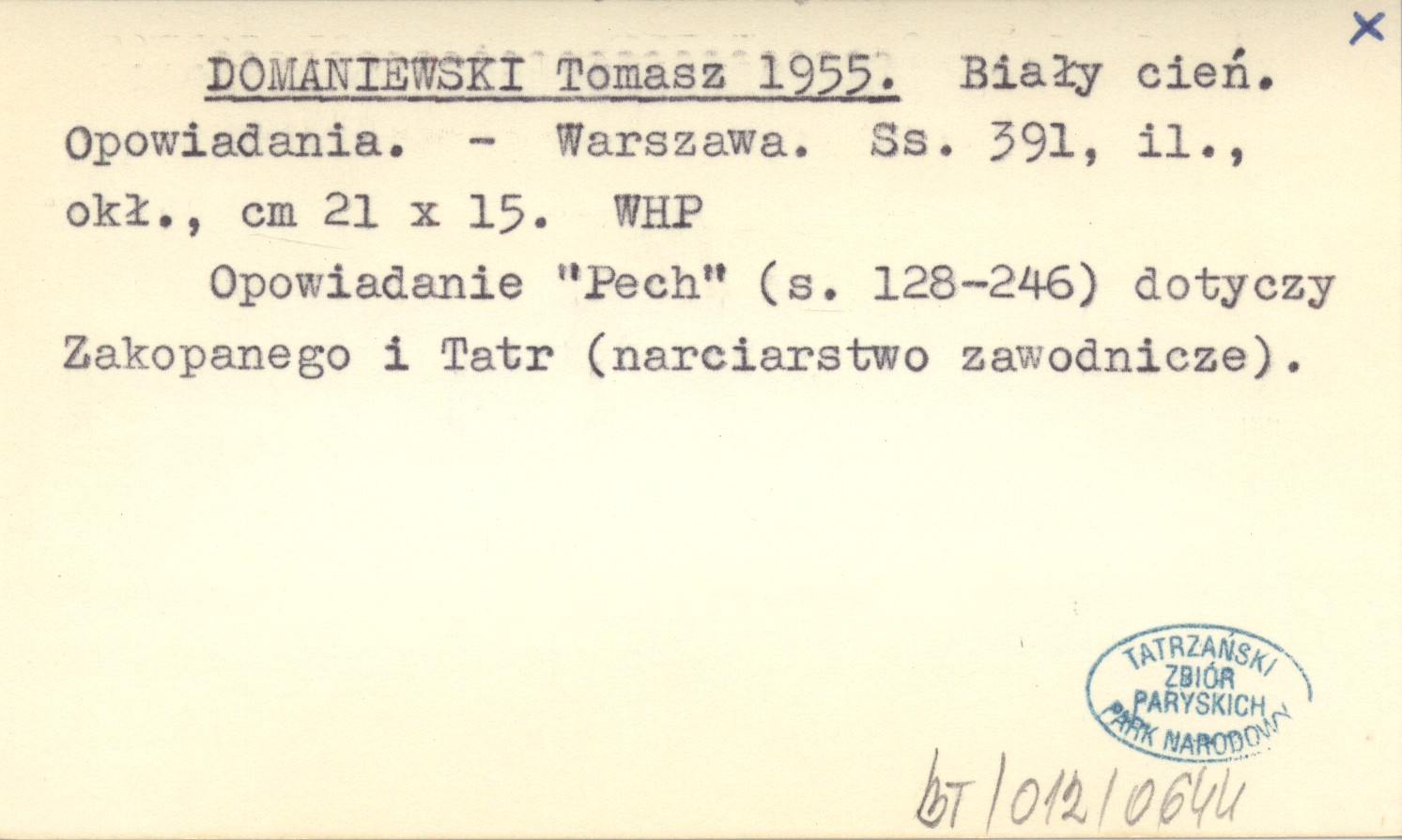 Warszawa , 391 s, il., okł., 21x15 cm. Opowiadanie "Pech" (s. 128-246) dotyczy Zakopanego i Tatr (narciarstwo zawodnicze).
