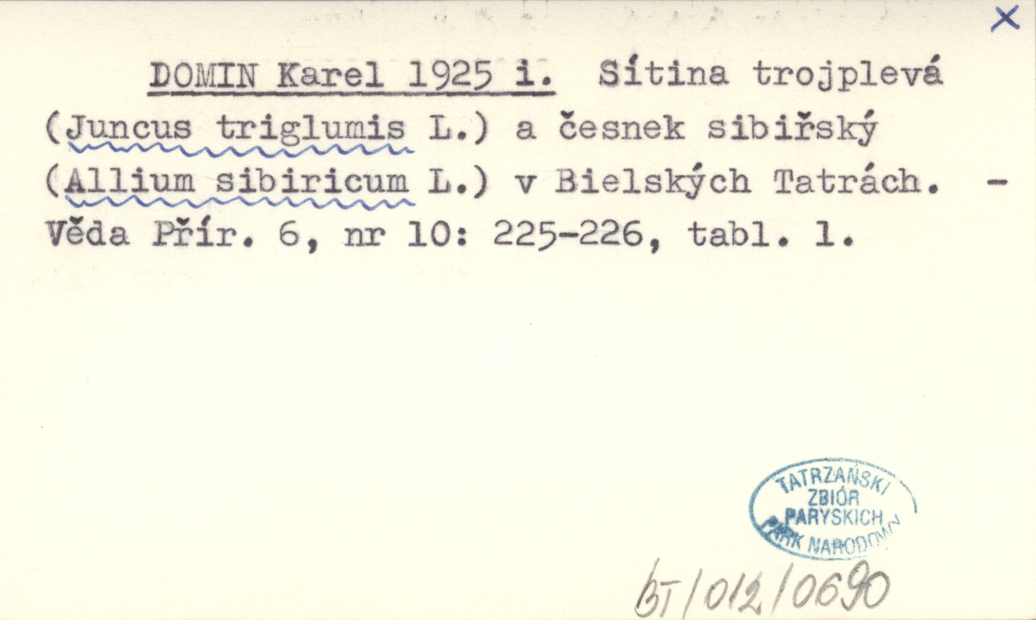 DOMIN Karel 1925 i Sítina trojplevá (Juncus triglumis L.) a česnek sibiřský (Allium sibiricum L.) v Bielských Tatrách.