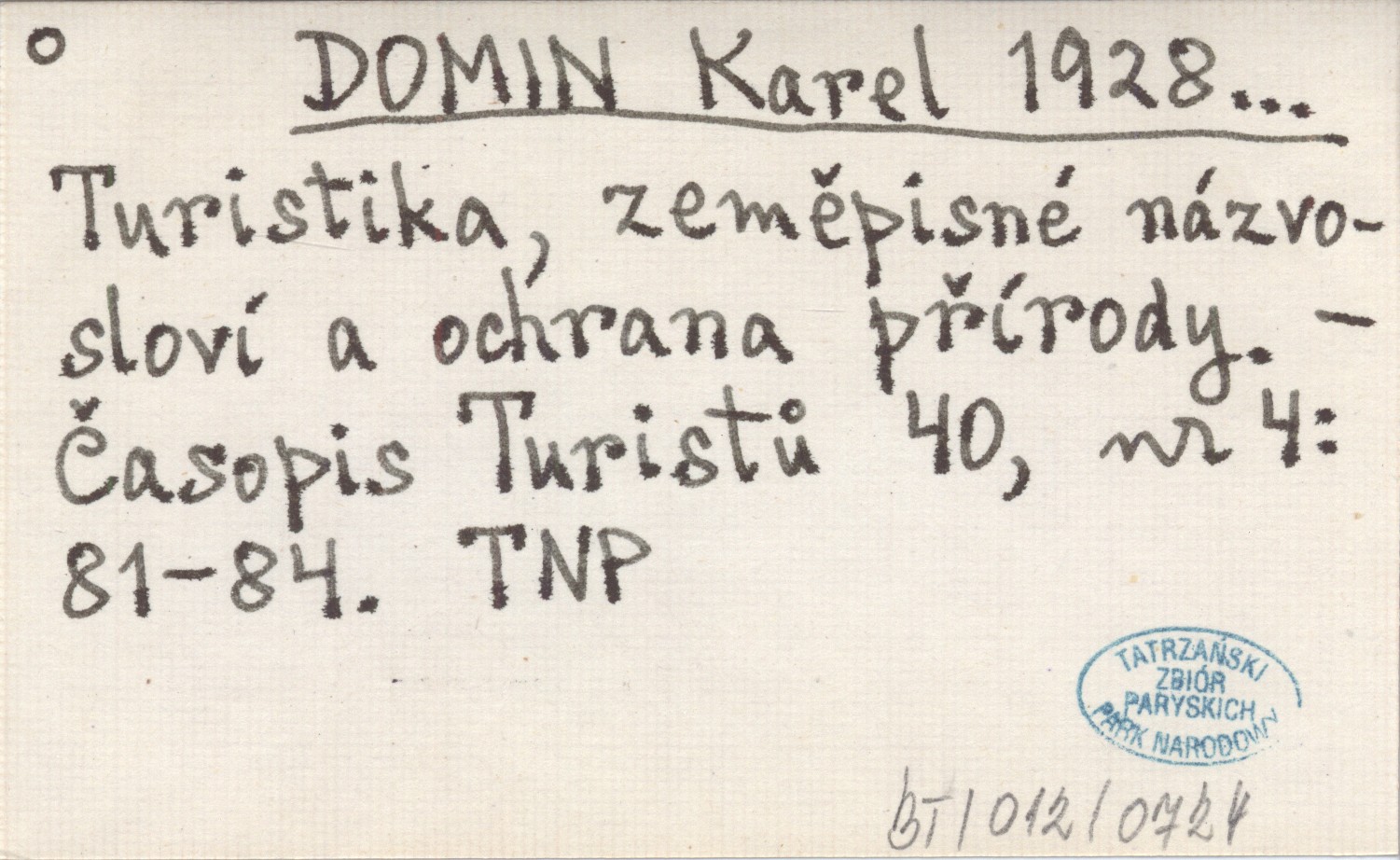 DOMIN Karel 1928... Turistika, zeměpisné názvosloví a ochrana přírody.