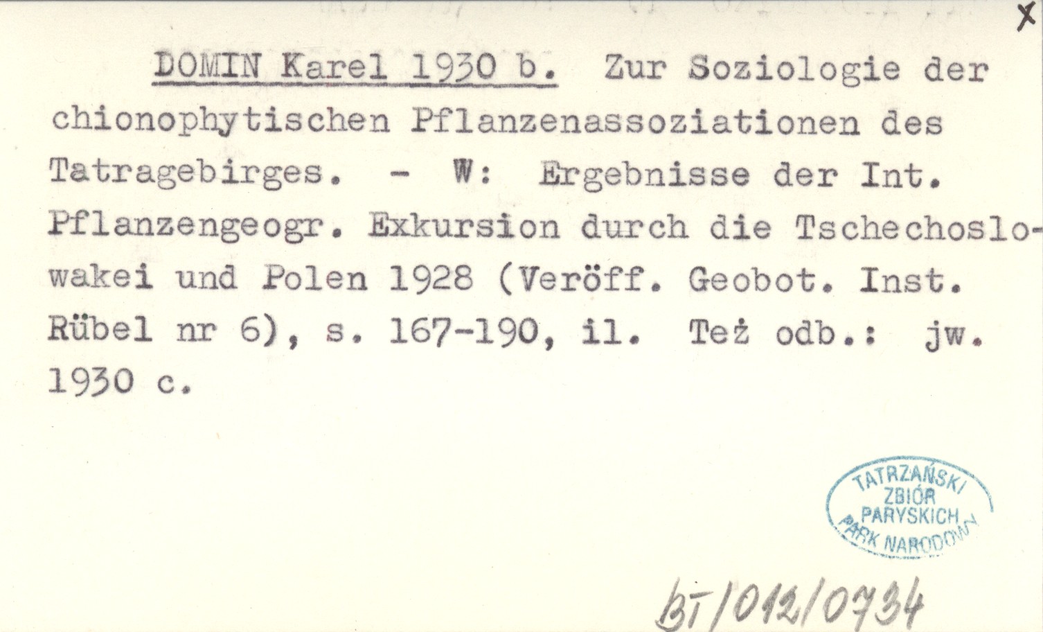 DOMIN Karel 1930 b Zur Soziologie der chionophytischen Pflanzenassoziationen des Tatragebirges.