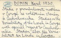 DOMIN Karel 1930 Studie o proměnlivosti modřínu v Evropě se zvláątním zřením k Československu. Studies on the Variability of the Larch in Europe with special regard to Czechoslovakia. Studien über die Variabilität der Lärche in Europa, insbesondere mit Rücksicht auf die Tschechoslowakei.