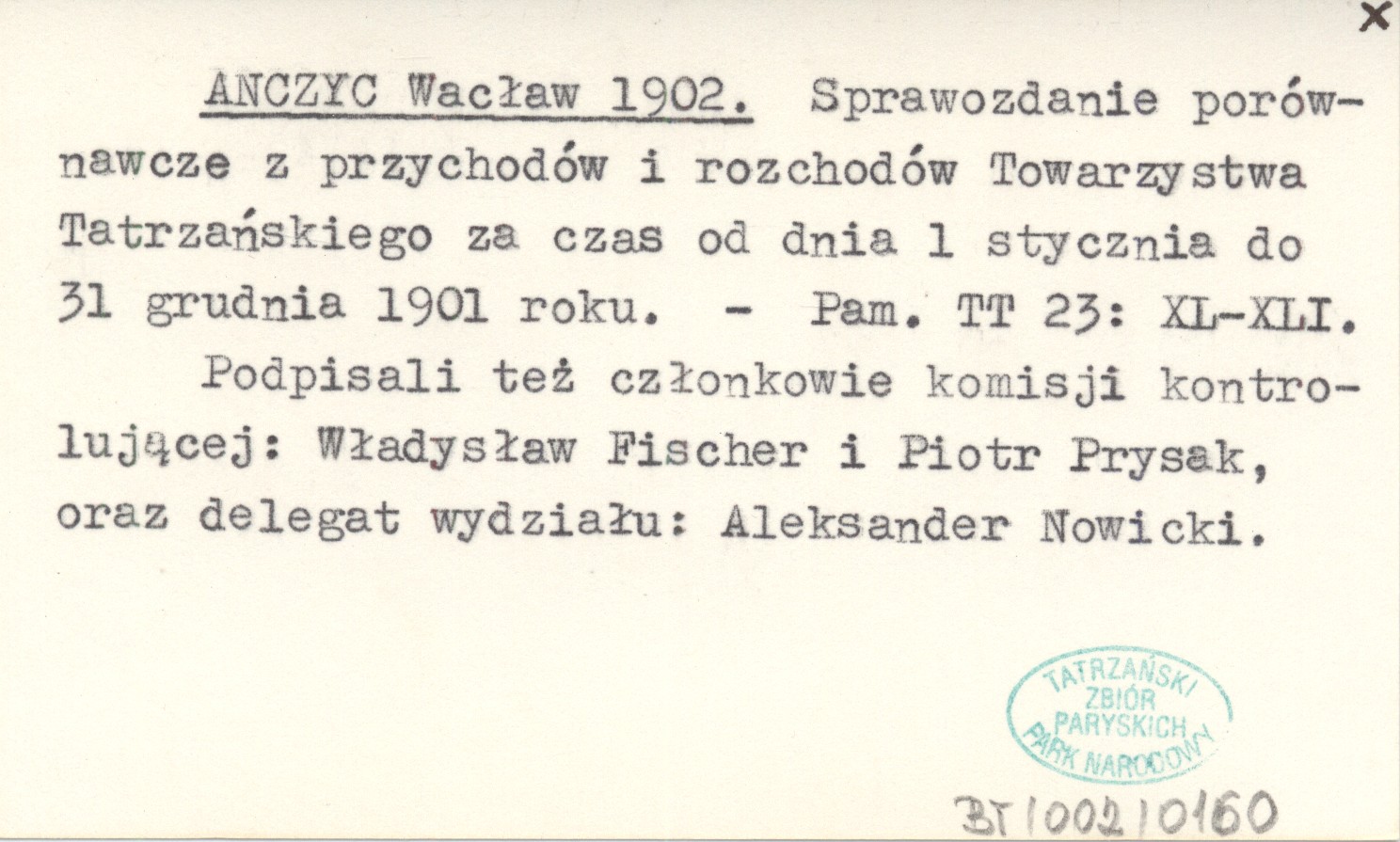 Pamiętnik Towarzystwa Tatrzańskiego, 23: XL-XLI. Podpisali też członkowie komisji kontrolującej: Władysław Fischer i Piotr Prysak, oraz delegat wydziału: Aleksander Nowicki.
