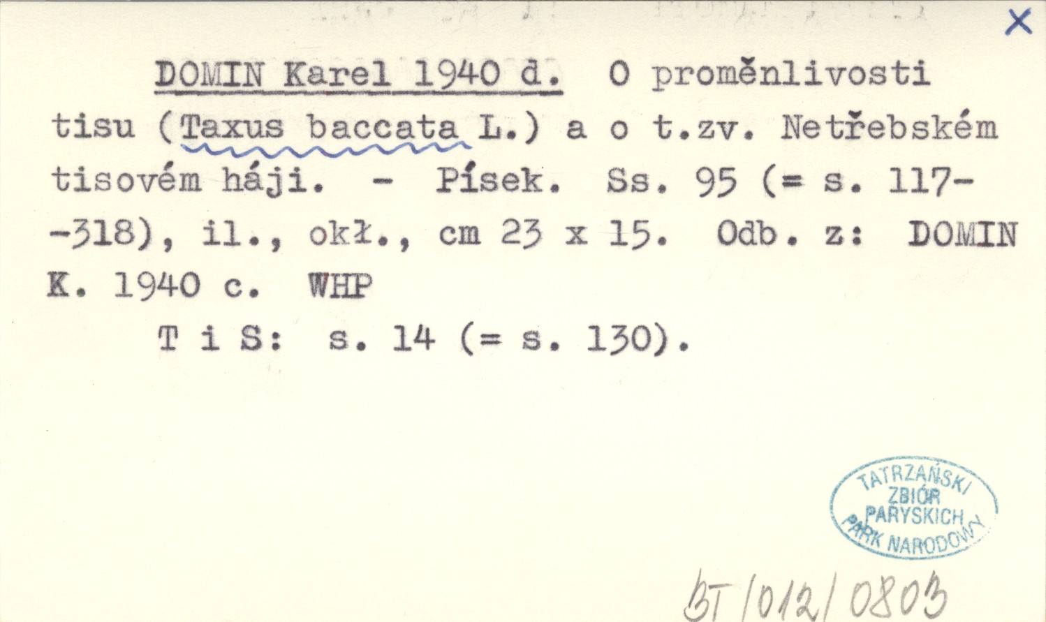 DOMIN Karel 1940 d O proměnlivosti tisu (Taxus baccata L.) a o t.zv. Netřebském tisovém háji.