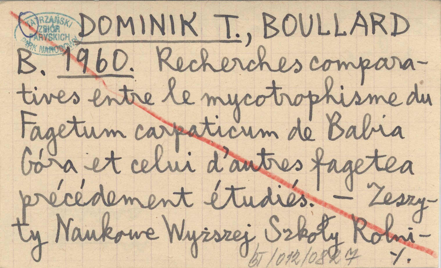 DOMINIK T. BOULLARD, B. ; 1960 Recherches comparatives entre le mycotrophisme du Fagetum carpaticum de Babia Góra et celui d'autres fagetea précédement étudiés.