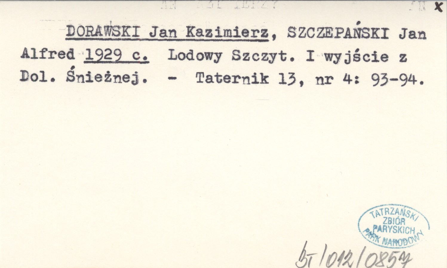 DORAWSKI Jan Kazimierz SZCZEPAŃSKI, Jan Alfred. ; 1929 c Lodowy Szczyt. I wejście z Dol. Śnieżnej.