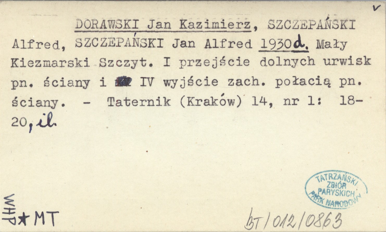 DORAWSKI Jan Kazimierz SZCZEPAŃSKI, Alfred. ; SZCZEPAŃSKI, Jan Alfred. ; 1930 d Mały Kiezmarski Szczyt. I przejście dolnych urwisk pn. ściany i IV wyjście zach. połacią pn. ściany.
