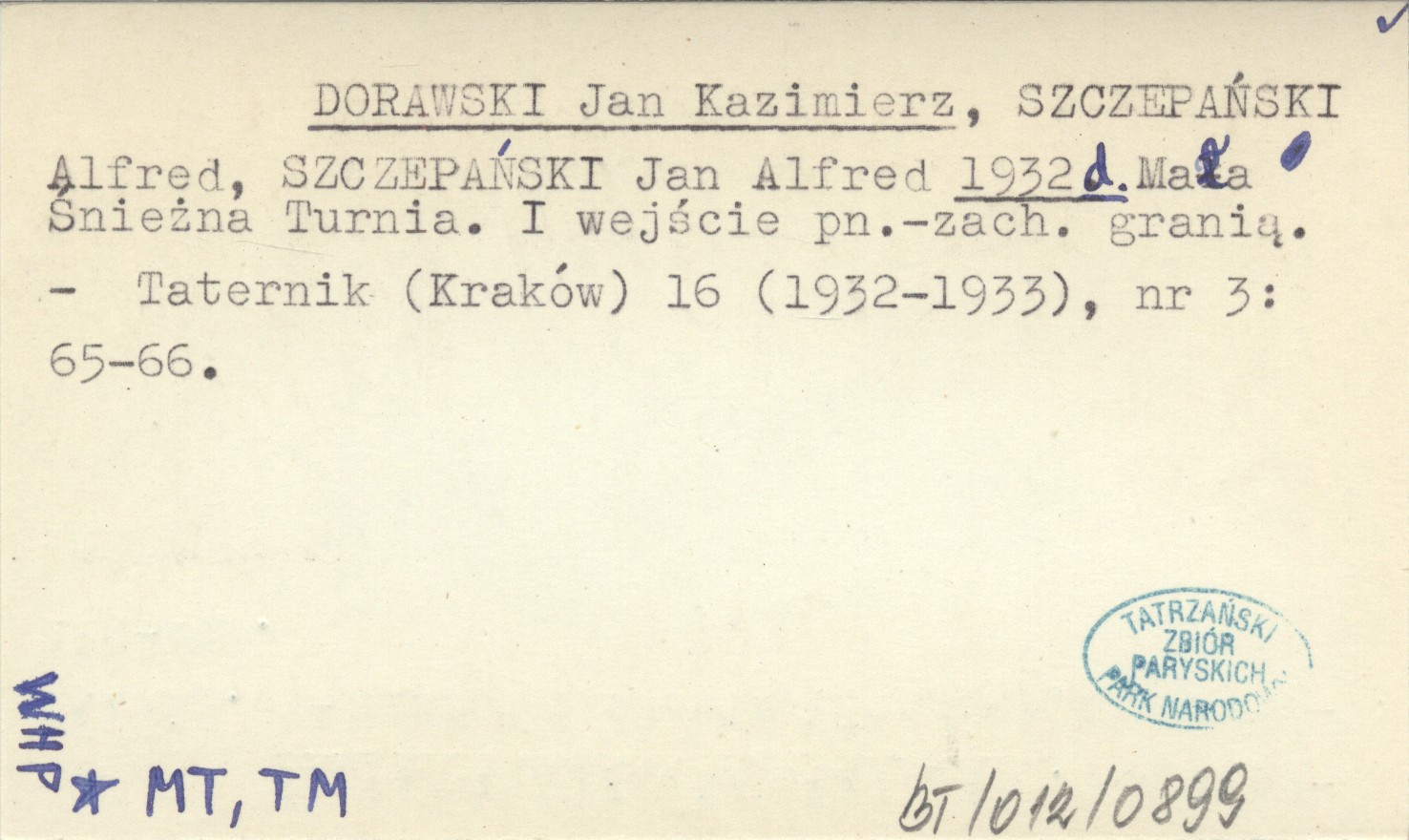 DORAWSKI Jan Kazimierz SZCZEPAŃSKI, Alfred. ; SZCZEPAŃSKI, Jan Alfred. ; 1932 d Mała Śnieżna Turnia. I wejście pn.-zach. granią.