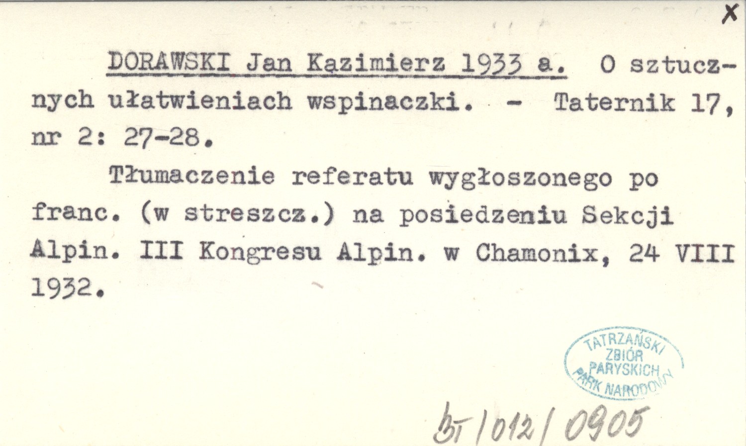 Taternik, 17, nr 2: 27-28. Tłumaczenie referatu wygłoszonego po franc. (w streszcz.) na posiedzeniu Sekcji Alpin. III Kongresu Alpin. w Chamonix, 24 VIII 1932.