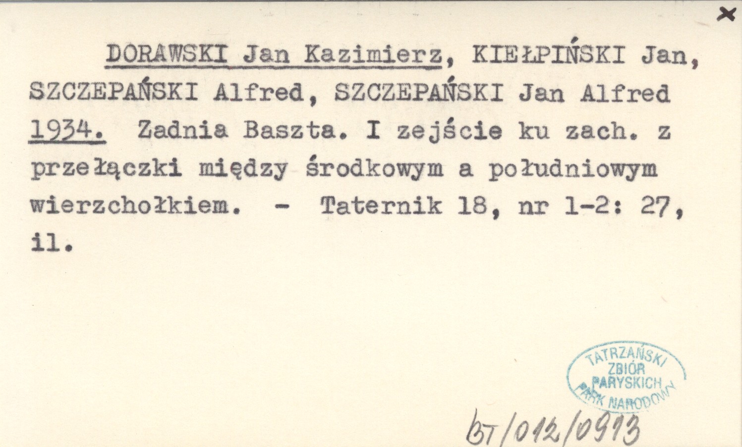 DORAWSKI Jan Kazimierz KIEŁPIŃSKI, Jan. ; SZCZEPAŃSKI, Alfred. ; SZCZEPAŃSKI, Jan Alfred. ; 1934 Zadnia Baszta. I zejście ku zach. z przełączki między środkowym a południowym wierzchołkiem.