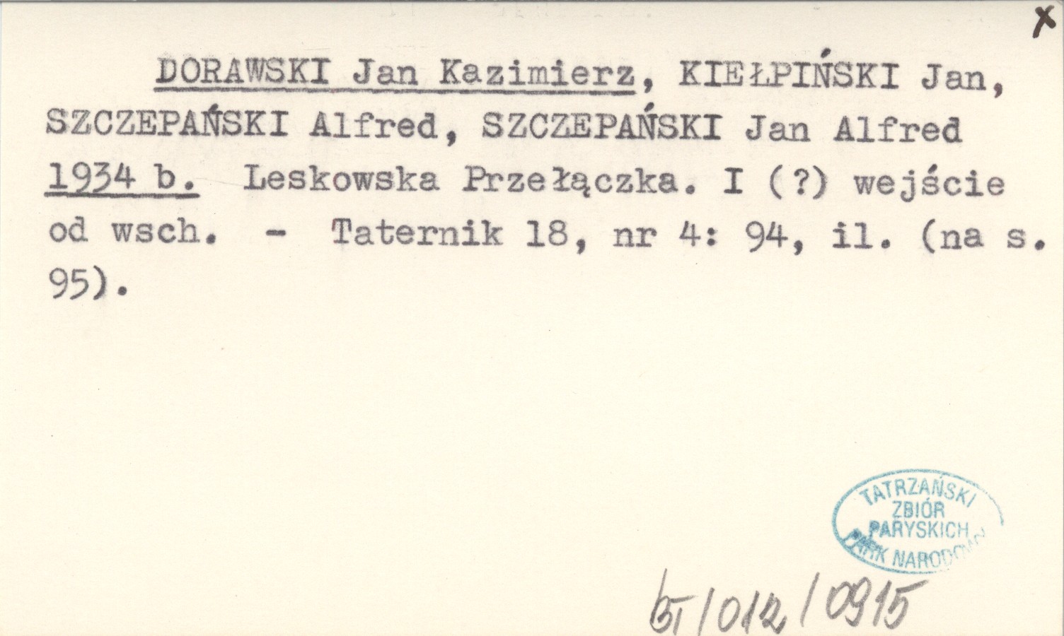 DORAWSKI Jan Kazimierz KIEŁPIŃSKI, Jan. ; SZCZEPAŃSKI, Alfred. ; SZCZEPAŃSKI, Jan Alfred. ; 1934 b Leskowska Przełączka. I (?) wejście od wsch.