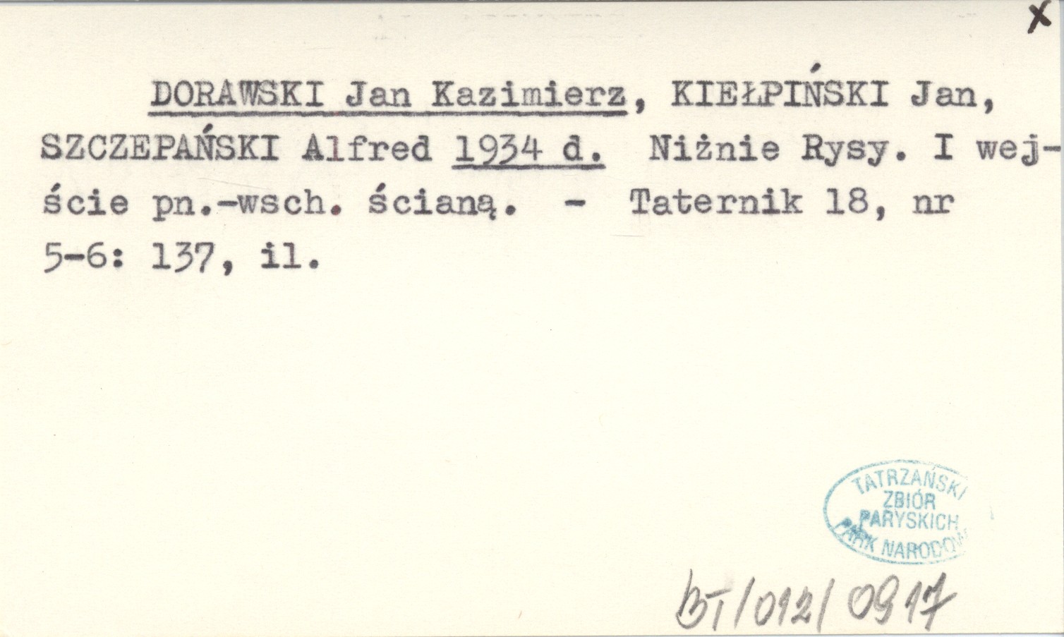 DORAWSKI Jan Kazimierz KIEŁPIŃSKI, Jan. ; SZCZEPAŃSKI, Alfred. ; 1934 d Niżnie Rysy. I wejście pn.-wsch. ścianą.