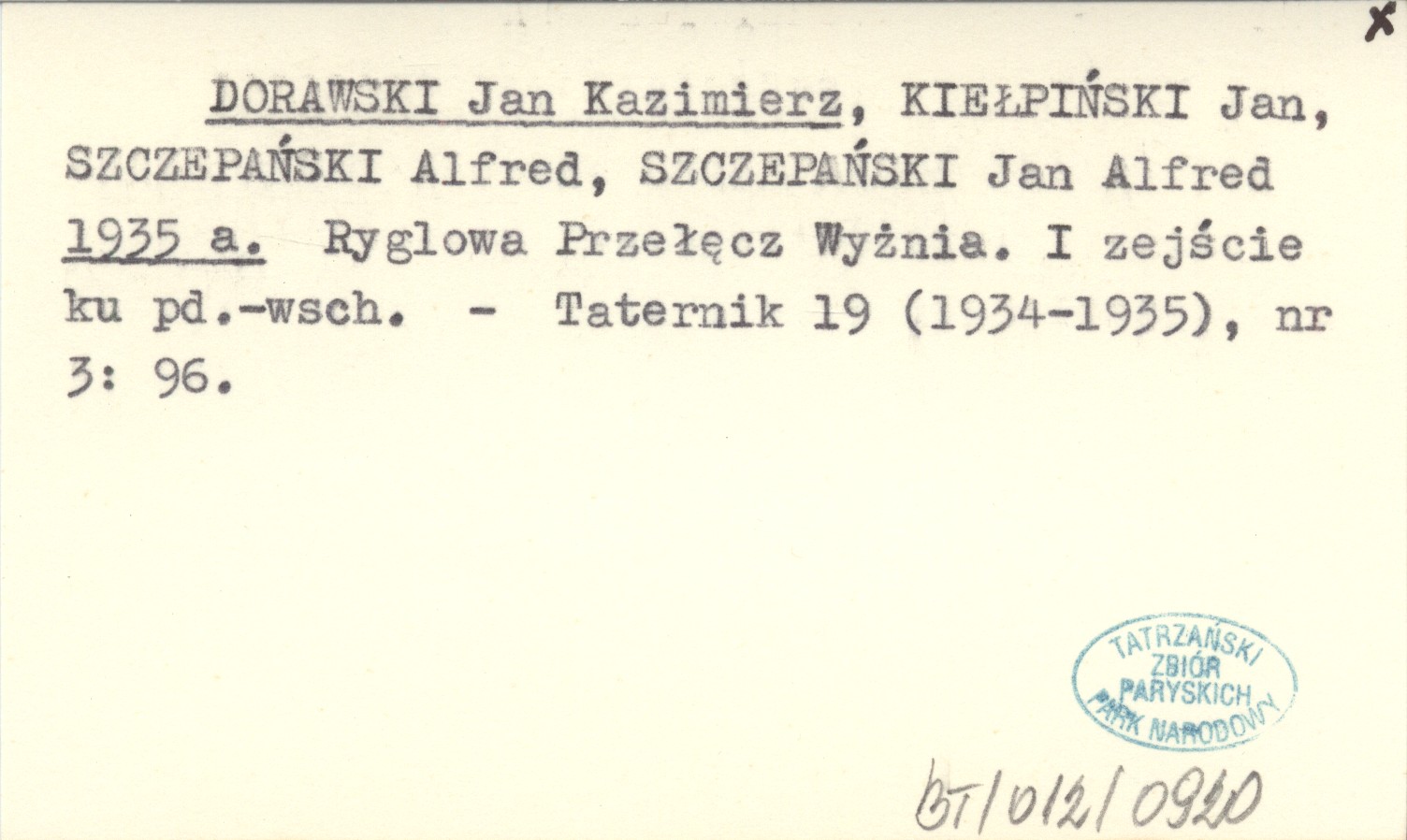 DORAWSKI Jan Kazimierz KIEŁPIŃSKI, Jan. ; SZCZEPAŃSKI, Alfred. ; SZCZEPAŃSKI, Jan Alfred. ; 1935 a Ryglowa Przełęcz Wyżnia. I zejście ku pn.-wsch.