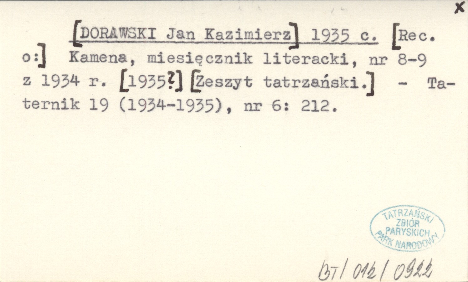 [DORAWSKI Jan Kazimierz] 1935 c [Rec. o:] Kamena, miesięcznik literacki, nr 8-9 z 1934 r. [1935?] [Zeszyt tatrzański.]