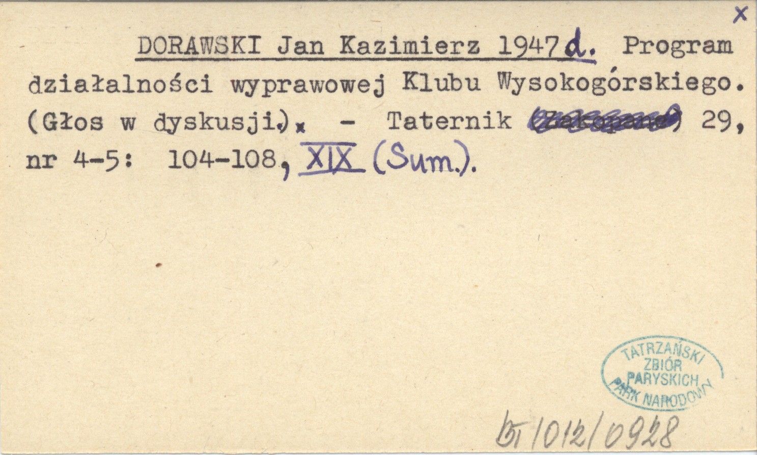 DORAWSKI Jan Kazimierz 1947 d Program działalności wyprawowej Klubu Wysokogórskiego. (Głos w dyskusji).