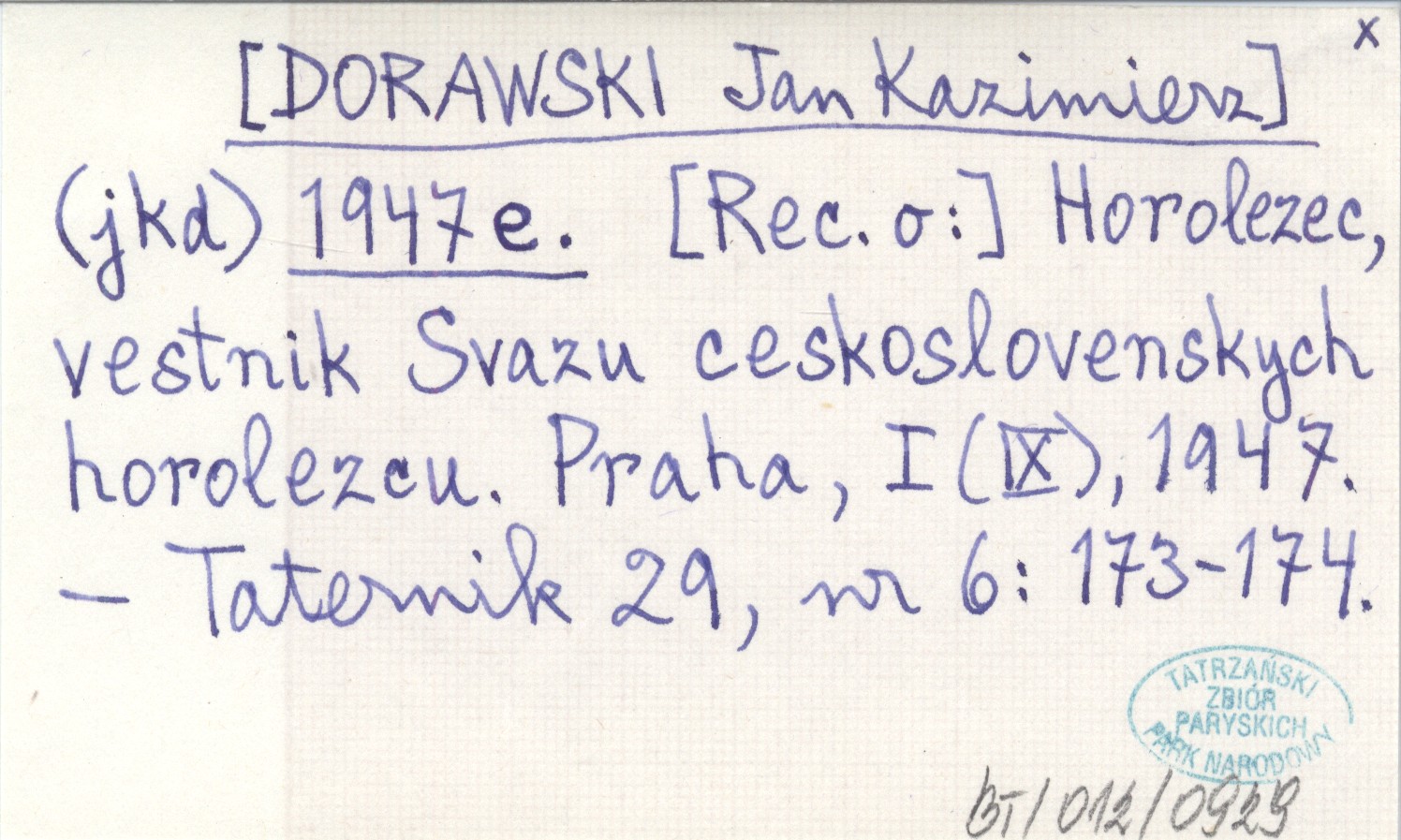 (jkd) [DORAWSKI Jan Kazimierz] 1947 e [Rec. o:] Horolezec, vestnik Svazu ceskoslovenskych horolezcu. Praha, I (IX), 1947.