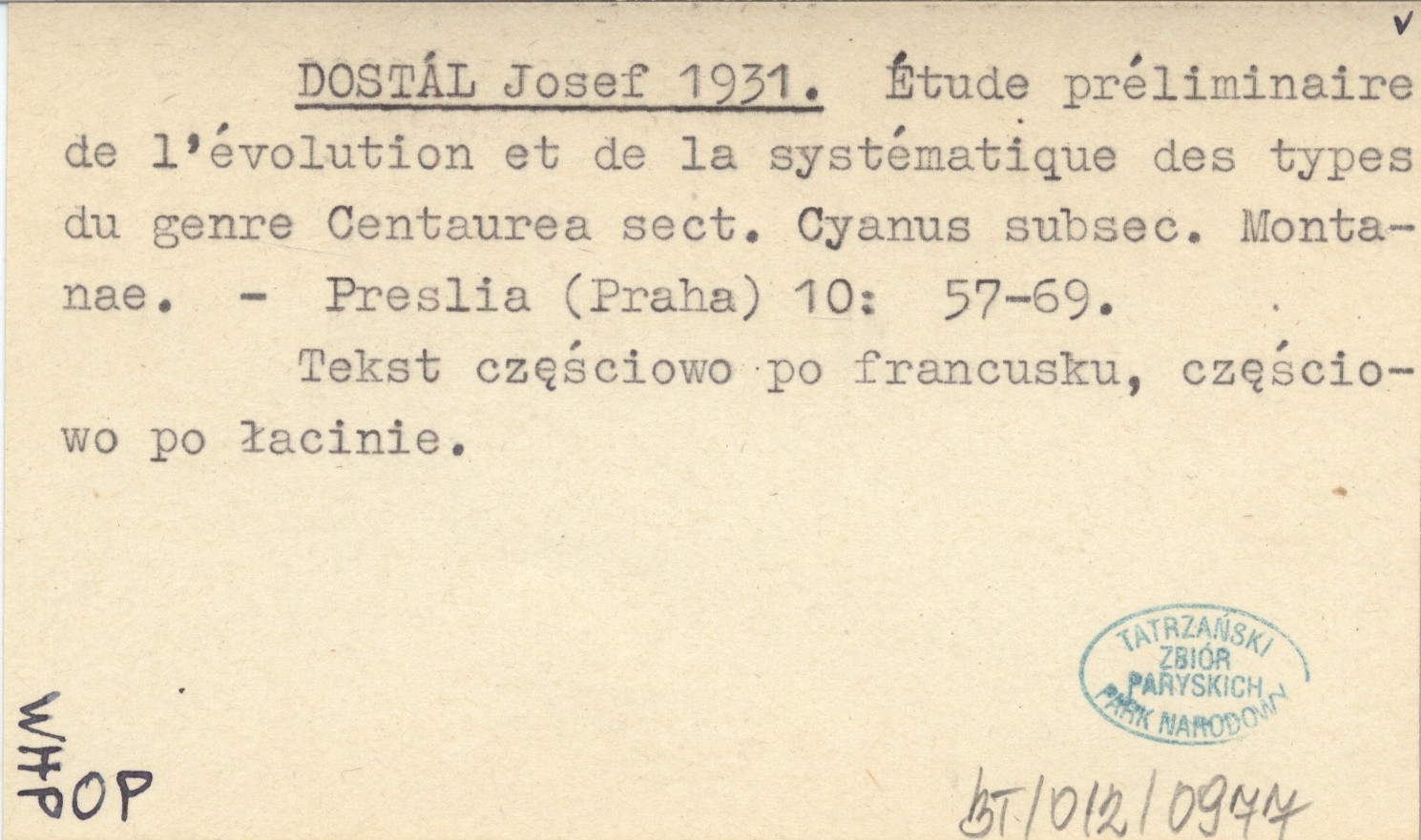 DOSTÁL Josef 1931 Étude préliminaire de l'évolution et de la systématique des types du genre Centaurea sect. Cyanus subsec. Montanae.