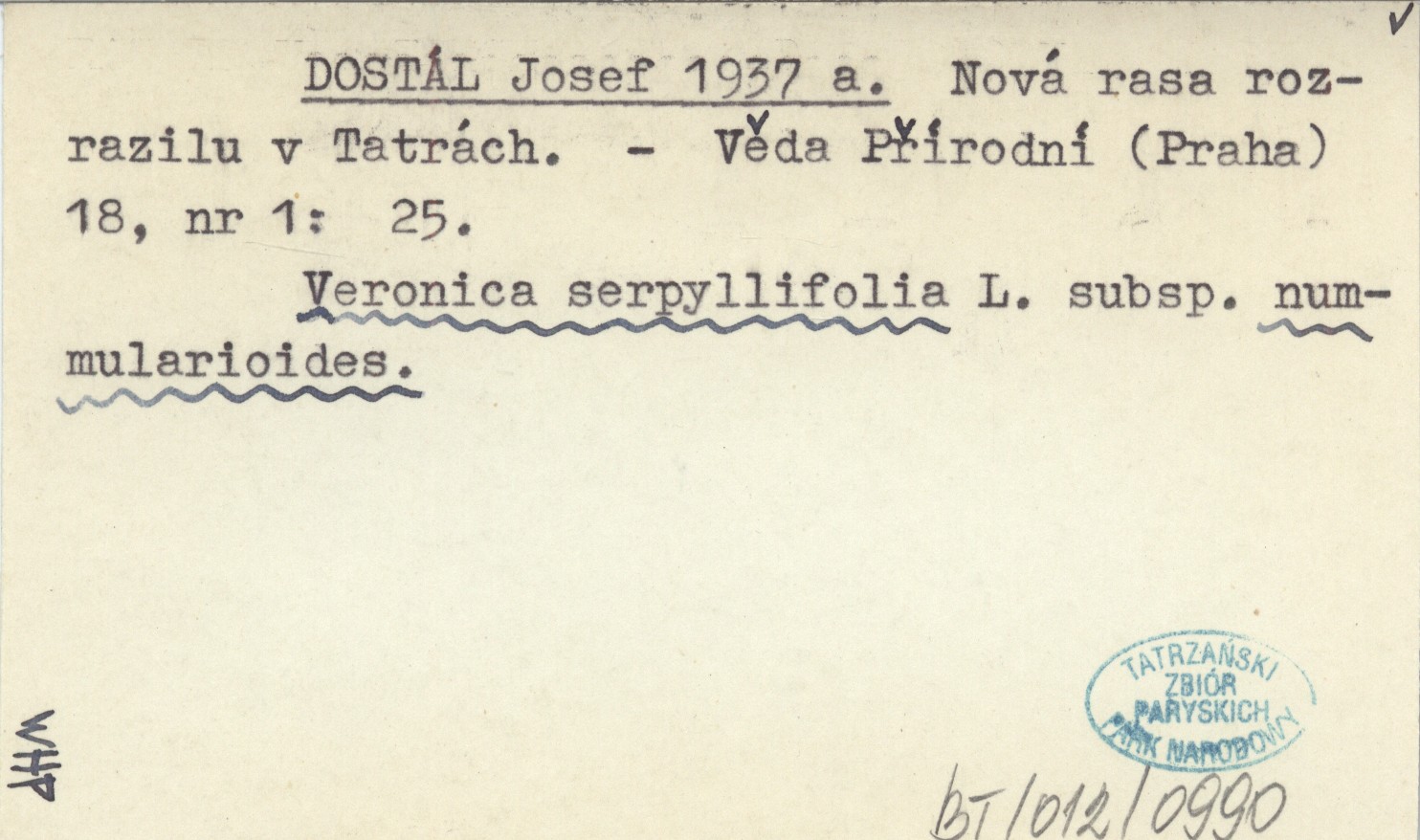 DOSTÁL Josef 1937 a Nová rasa rozrazilu v Tatrách.