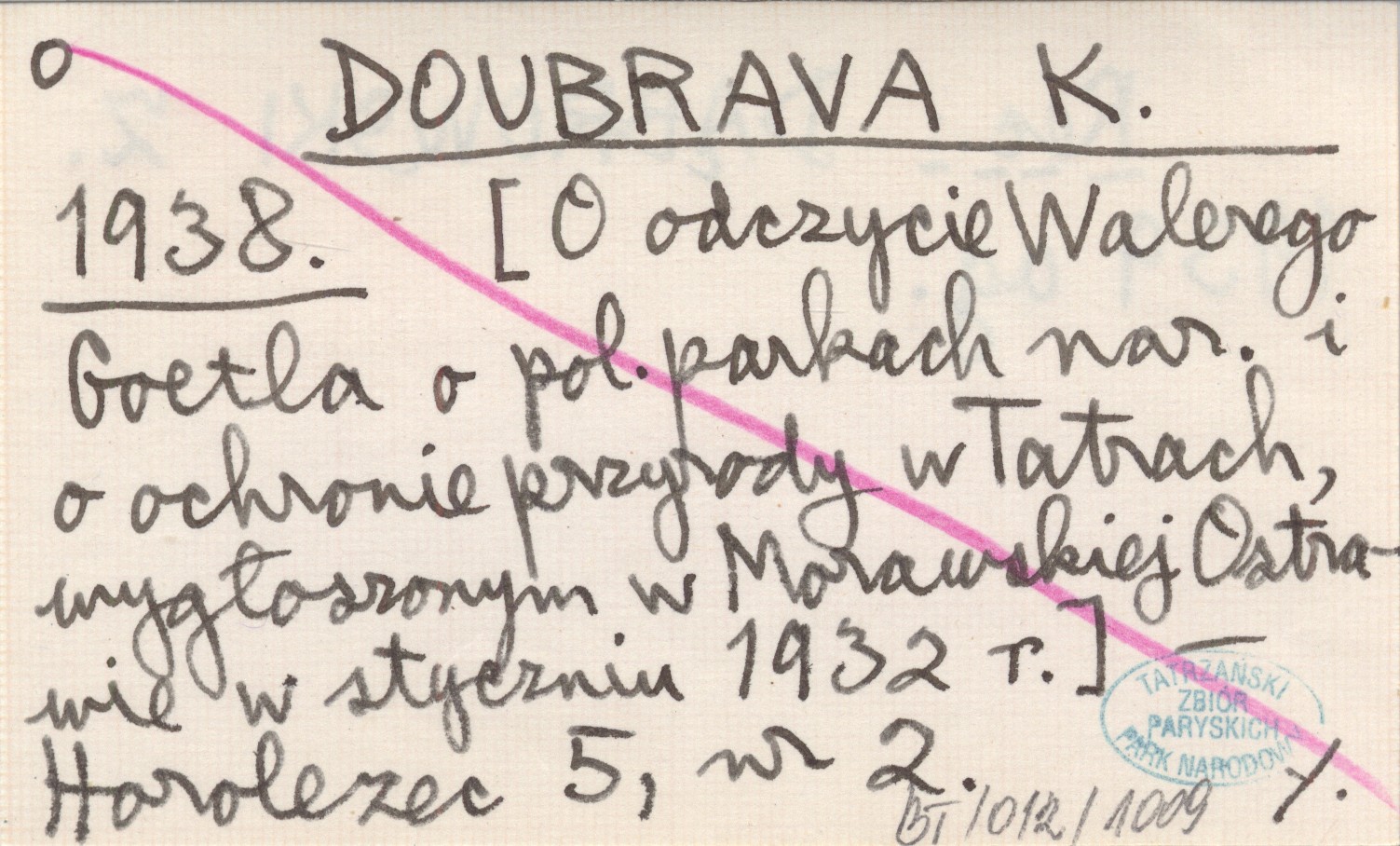 DOUBRAVA K. 1938 [O odczycie Walerego Goetla o polskich parkach narodowych i ochronie przyrody w Tatrach, wygłoszonym w Morawskiej Ostrawie w styczniu 1932 r.]
