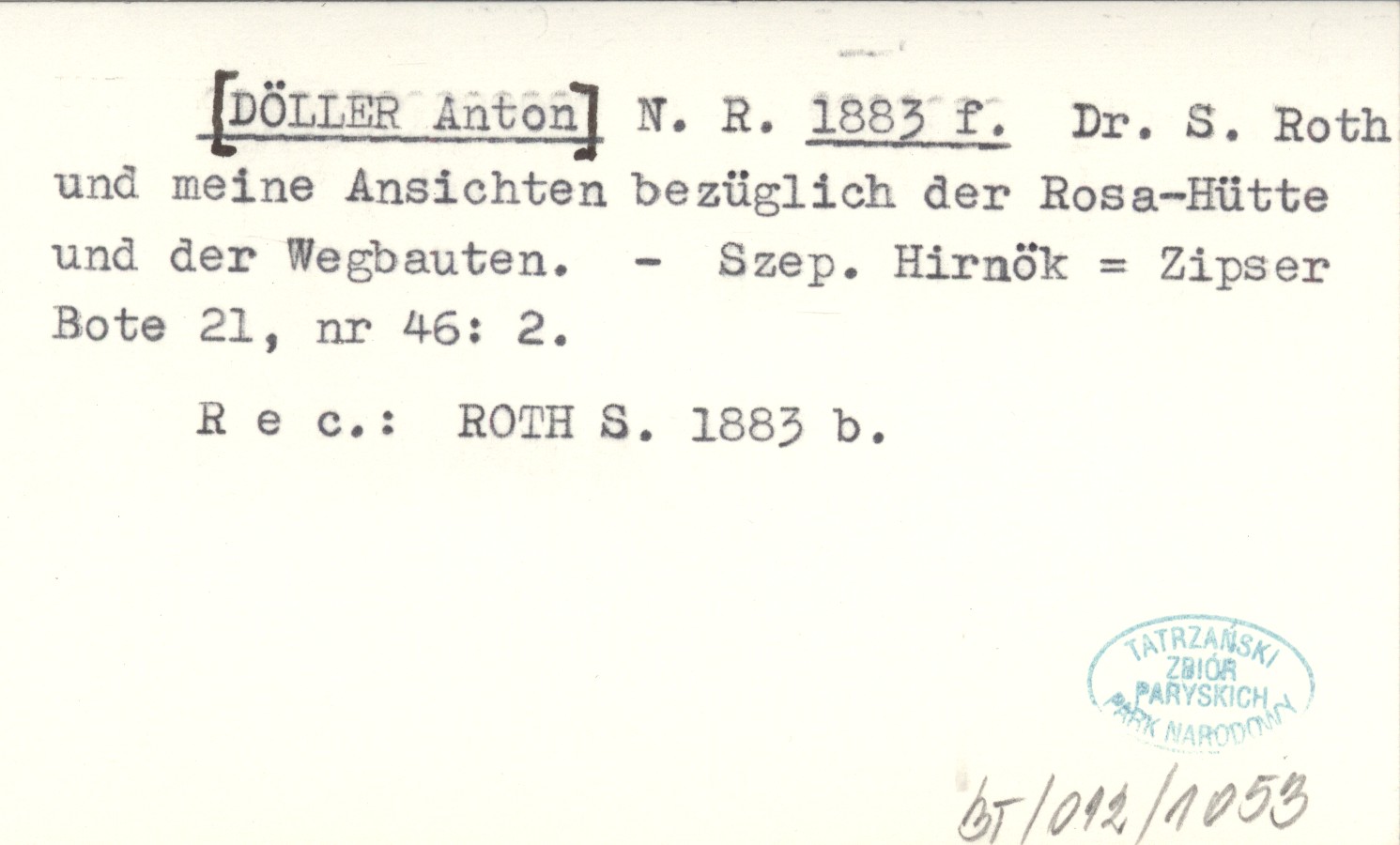 N. R. [DÖLLER Anton] 1883 f Dr. S. Roth und meine Ansichten bezüglich der Rosa-Hütte und der Wegbauten.