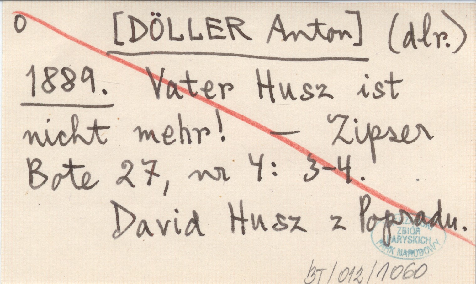 (dlr.) [DÖLLER Anton] 1889 Vater Husz ist nicht mehr.!