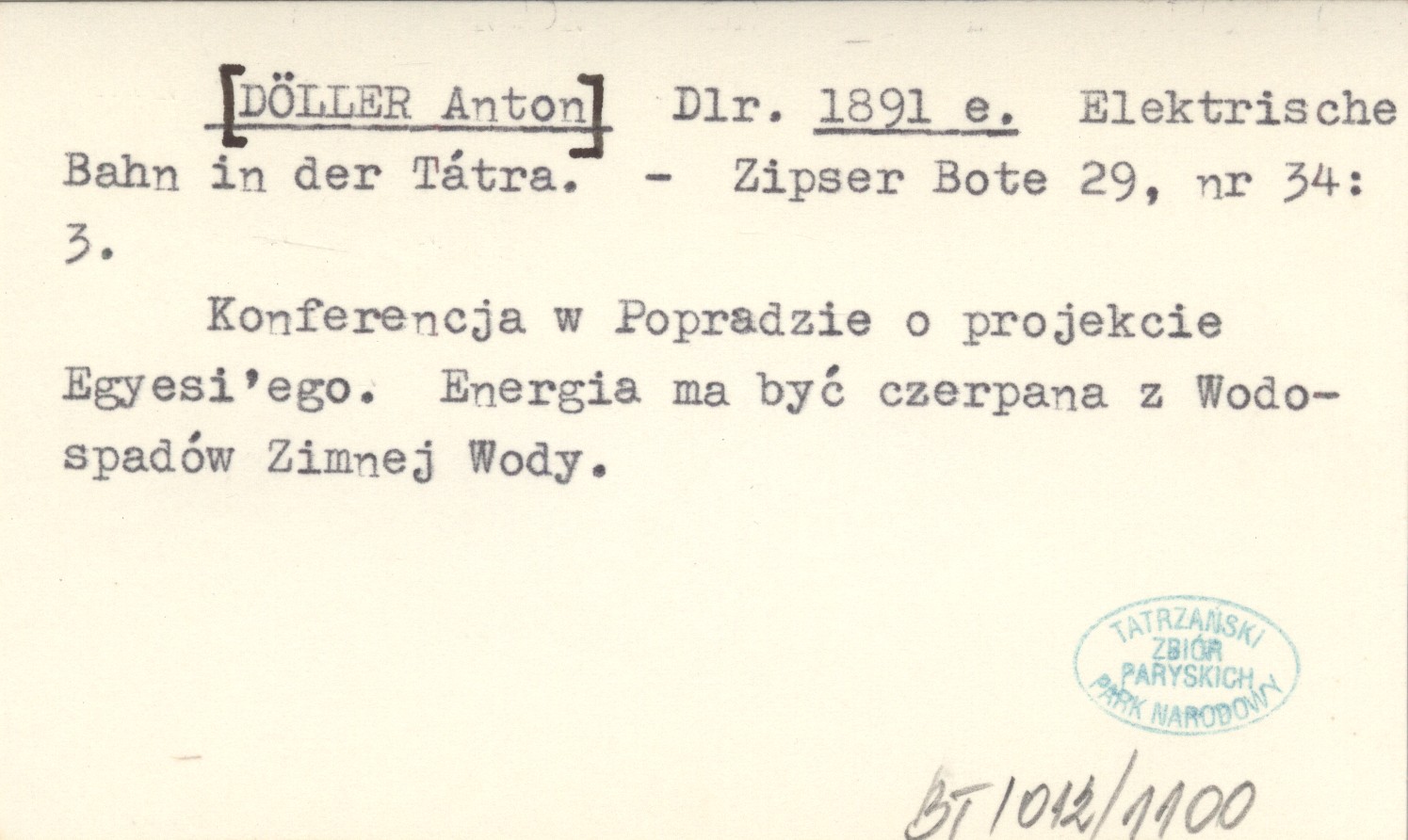 Dlr. [DÖLLER Anton] 1891 e Elektrische Bahn in der Tátra.