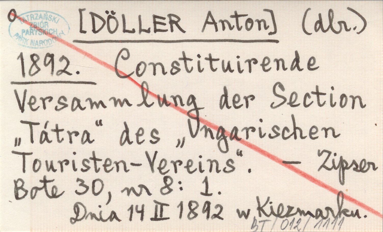 (dlr.) [DÖLLER Anton] 1892 Constituirende Versammlung der Section "Tátra" des Ungarischen Touristen-Vereins.
