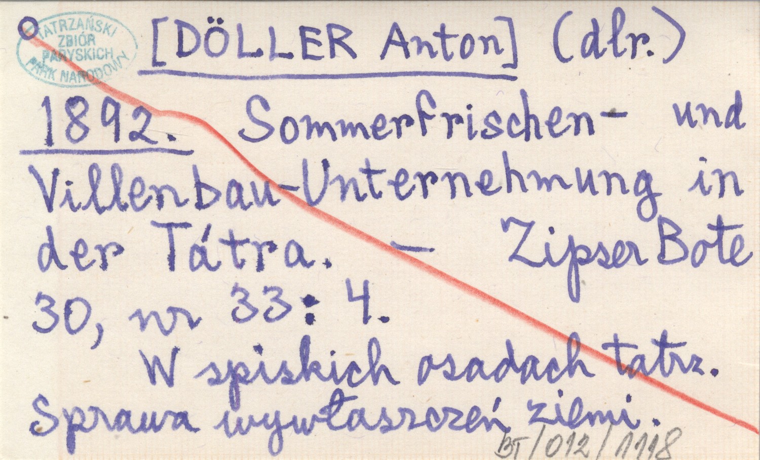 (dlr.) [DÖLLER Anton] 1892 Sommerfrischen- und Villenbau-Unternehmung in der Tátra.