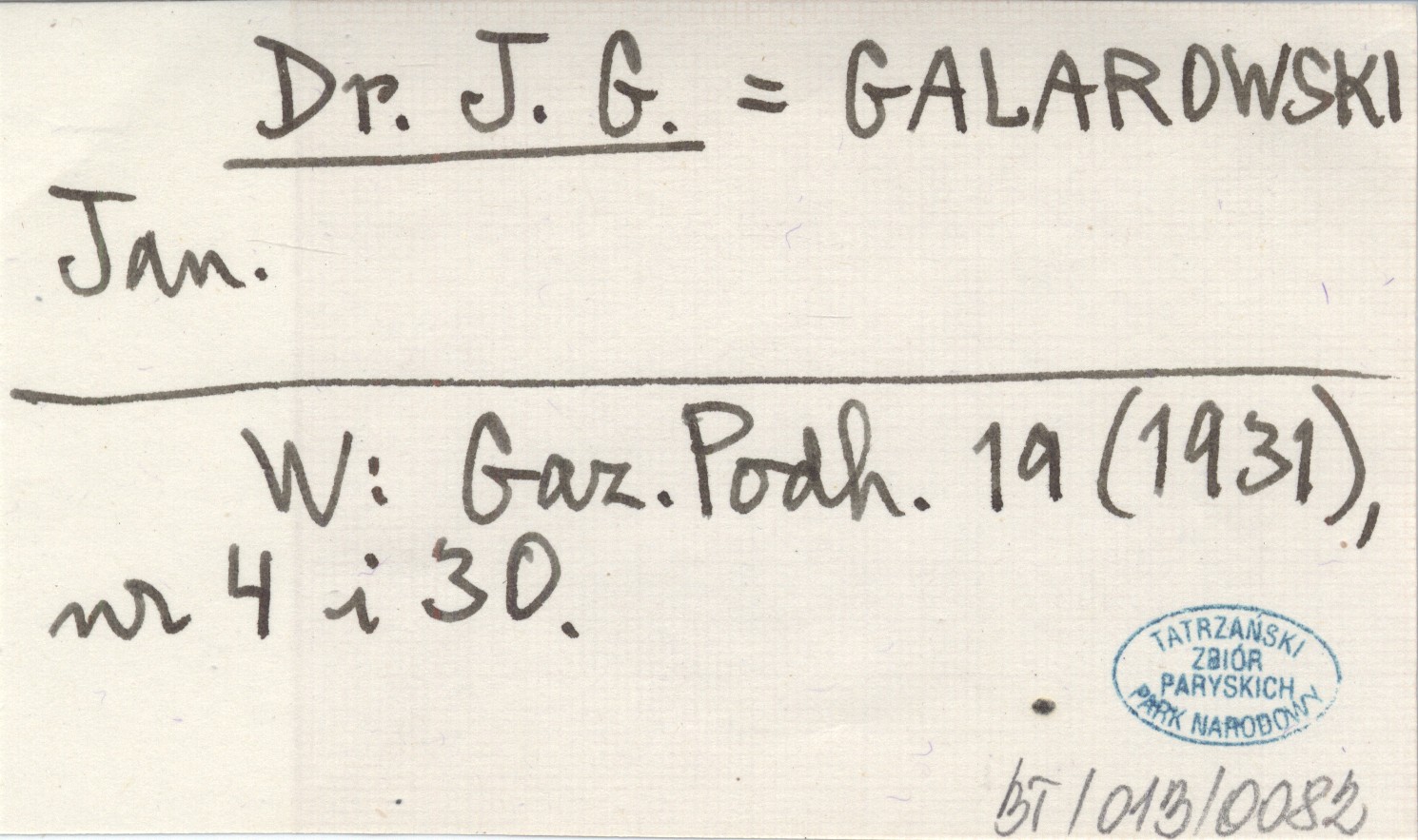 Dr. J. G. GALAROWSKI Jan Gazeta Podhalańska 19 (1931), nr 4, 30.