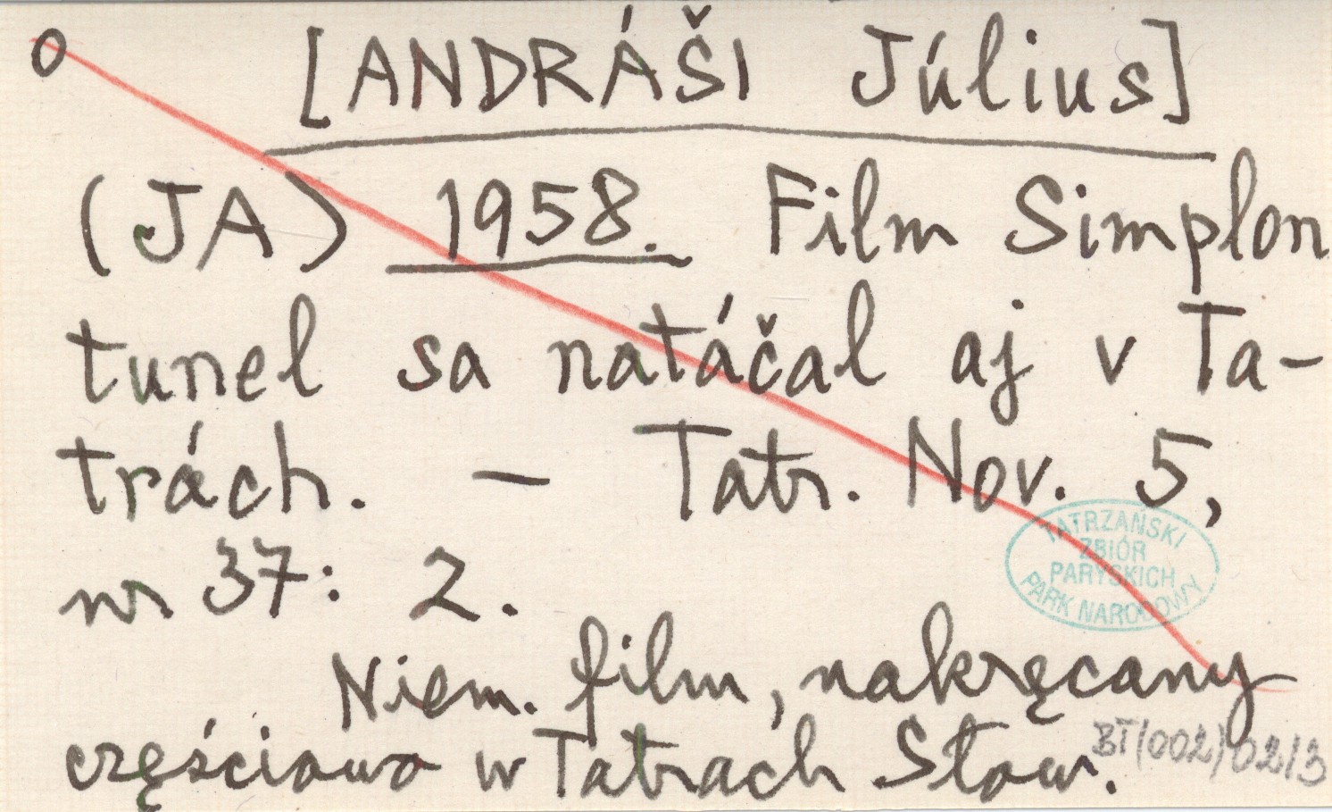 (JA) [ANDRÁŠI Július] 1958 Film Simplon tunel sa natáčal aj v Tatrách.