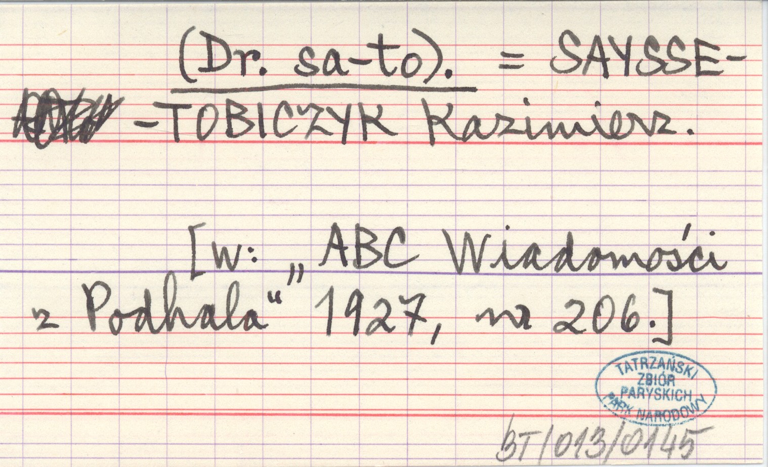(Dr. sa-to) SAYSSE-TOBICZYK Kazimierz ABC Wiadomości z Podhala 1927, nr 206.