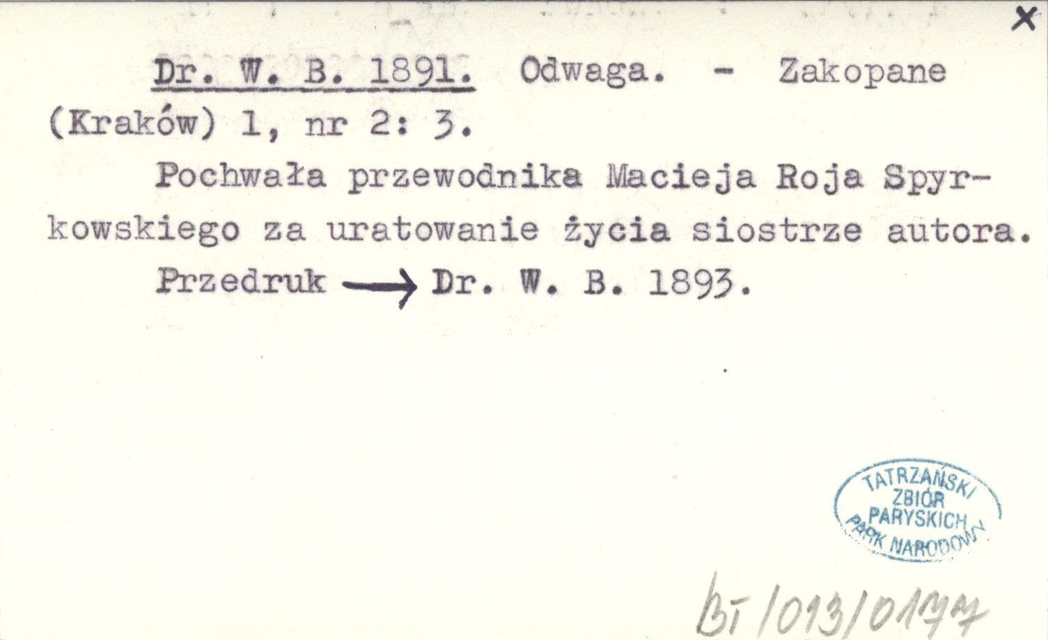Zakopane (Kraków) , 1, nr 2: 3. Pochwała przewodnika Macieja Roja Spyrkowskiego za uratowanie życia siostrze autora. Przedruk: Dr. W. B. 1893