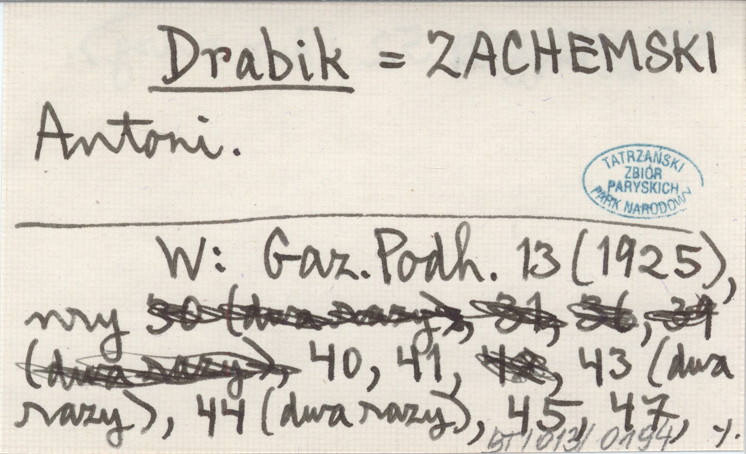 Drabik ZACHEMSKI Antoni Gazeta Podhalańska 13 (1925), nr 40, 41, 43 (dwa razy), 44 (dwa razy), 45, 47, 52 (dwa razy).