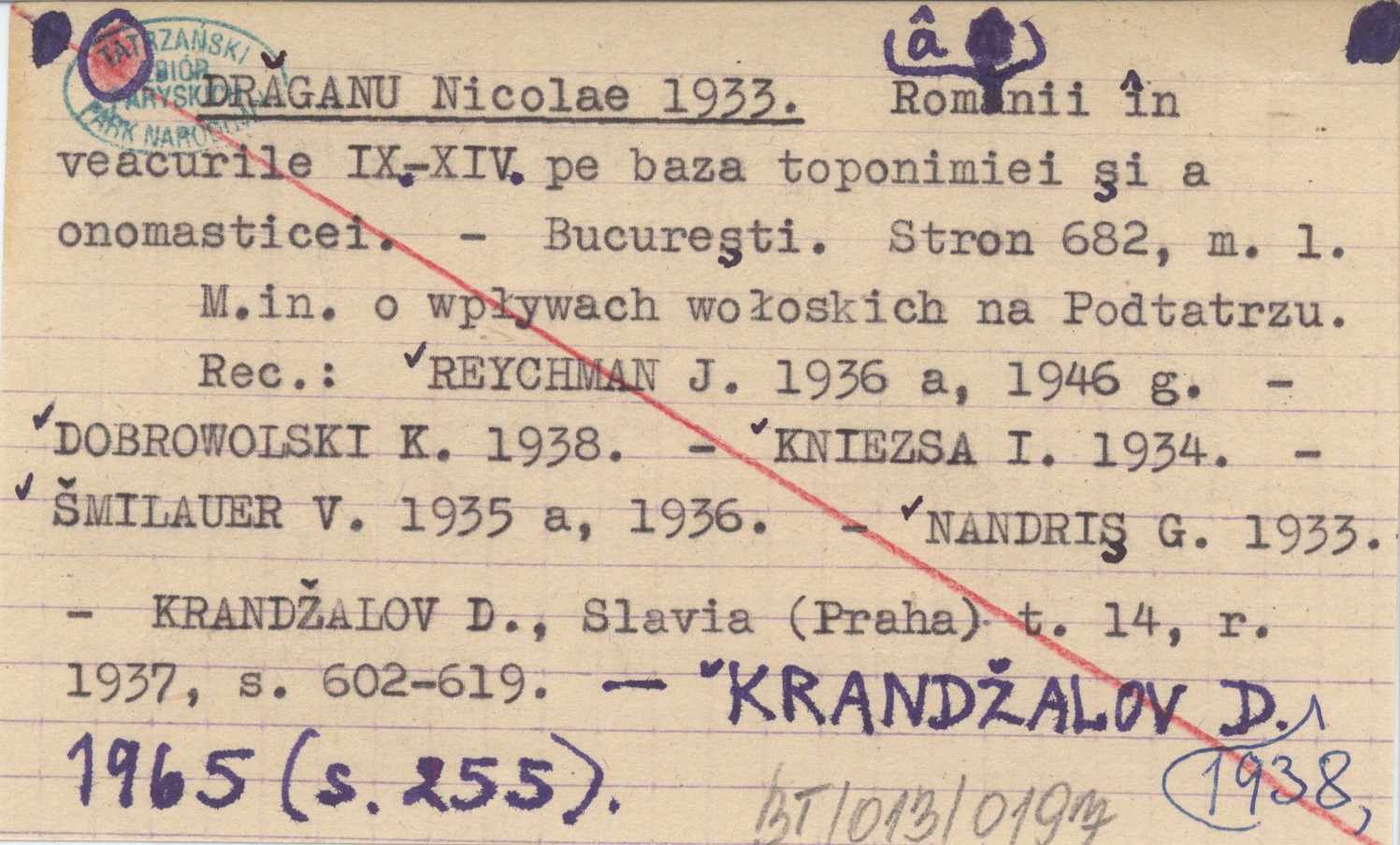 REC: REYCHMAN J. 1936 a, 1946 g ; DOBROWOLSKI K. 1938 ; KNIEZSA I. 1934 ; ©MILAUER V. 1935 a, 1936 ; NANDRIŞ G. 1933 ; KRAND®ALOV D., Slavia (Praha) t. 14, r. 1937: 602-619. ; KRAND®ALOV D. 1938, 1965: 255. ;